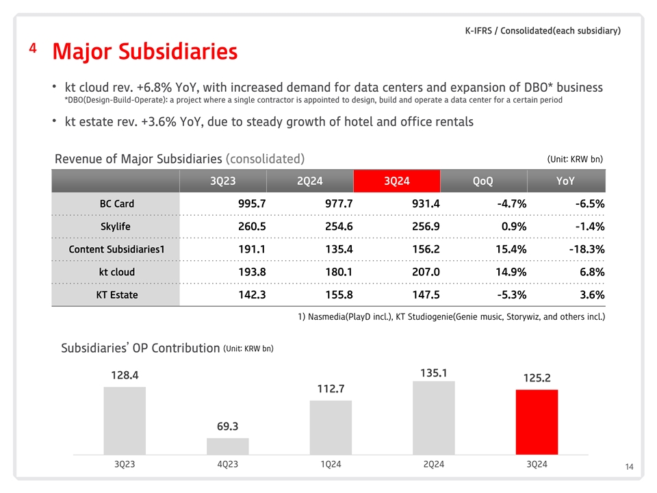K-IFRS/Separate 3 KT-B2B服务• B2B服务rev. + 2.5% YoY,尽管精简了低利润业务,但仍专注于基于服务的业务(单位:十亿韩元)3Q23 2Q24 3Q24 QoQ YoY 903.888 2.79 26.4 4.9% 2.5% B2B服务77.98 3.689.67.3% 15.1%房地产等5大增长动力公司宽带/数据收入收入(单位:十亿韩元)(单位:十亿韩元)327.03 23.53 24.23 21.63 18.11 19.3 YoY + 0.8% YoY + 27.0% 96.09 3.99 2.8 QoQ-0.9 % QoQ + 24.2% 73.7 3Q23 4Q23 1Q24 2Q24 3Q24 3Q23 4Q23 1Q24 2Q24 3Q24 * Corp.宽带/数据rev包括:* 5大增长动力包括:租赁线、Kornet、VPN、全球数据AICC、物联网、智能出行、智能空间、能源业务。13