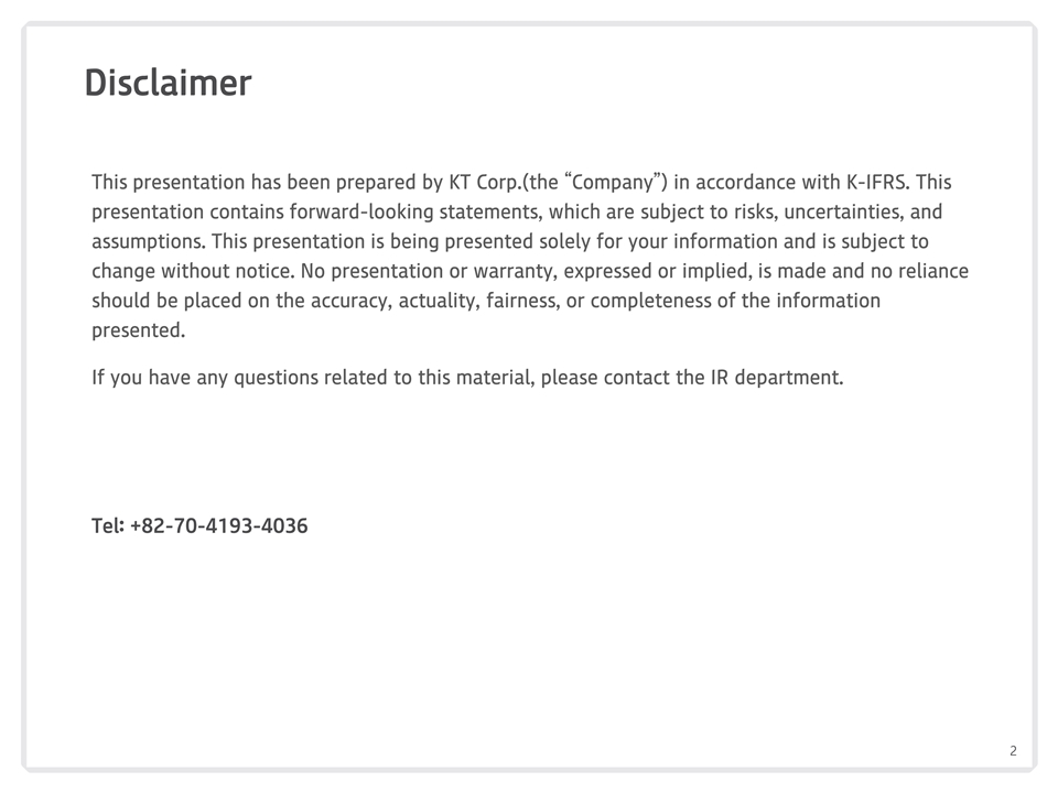 免责声明本演示文稿由KT Corp.(“公司”)根据K-IFRS编制。本演示文稿包含前瞻性陈述,这些陈述受风险、不确定性和假设的影响。此演示文稿仅供您参考,如有更改,恕不另行通知。不作任何明示或暗示的陈述或保证,也不应依赖所提供信息的准确性、现实性、公平性或完整性。如对本材料有任何疑问,请与IR部门联系。电话:+ 82-70-4193-4036 2