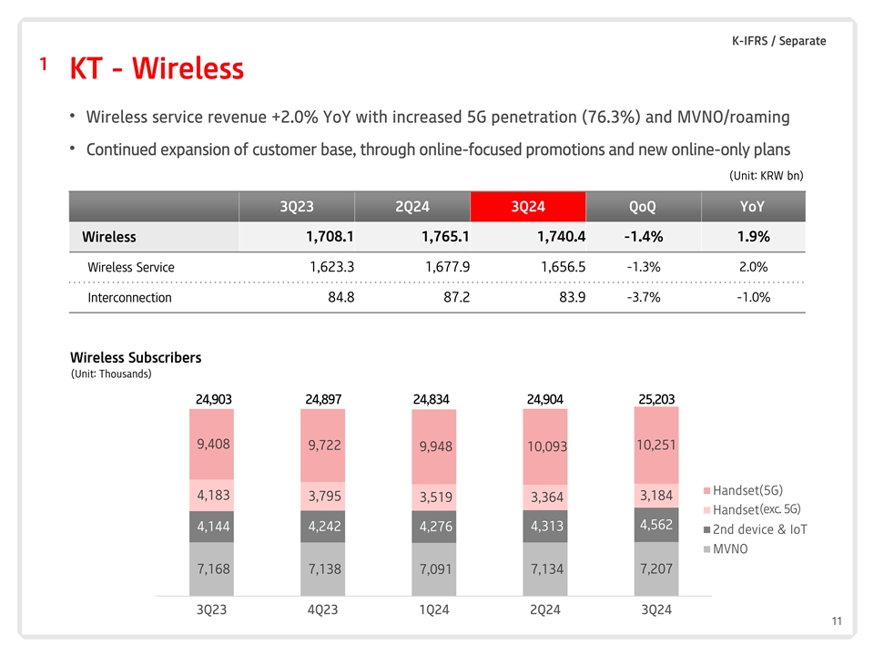 K-IFRS/Separate 2 KT-固话•宽带rev. + 0.4% YoY因保费计划和增值服务扩张•媒体rev.-1.2 % YoY因PPV下降尽管净用户增加(单位:十亿韩元)但广告收入(单位:十亿韩元)3Q23 2Q24 3Q24 QoQ YoY固话1,330.11,316.61,312.6-0.3 %-1.3 %宽带619.46 18.56 22.2 0.6% 0.4%媒体524.45 22.65 18.2-0.8 %-1.2 %家庭电话186.31 75.6 172.2-1.9 %-7.6 %宽带用户IPTV用户(单位:千)(单位:千)%用户净增占比(%)9,4409,9289,4309,8999,8629,4239,8109,4189,40968.9% 68.7% 68.5% 68.3% 68.0% 68.0% 3Q23 4Q23 1Q24 2Q24 3Q24 3Q23 4Q23 1Q24 2Q24