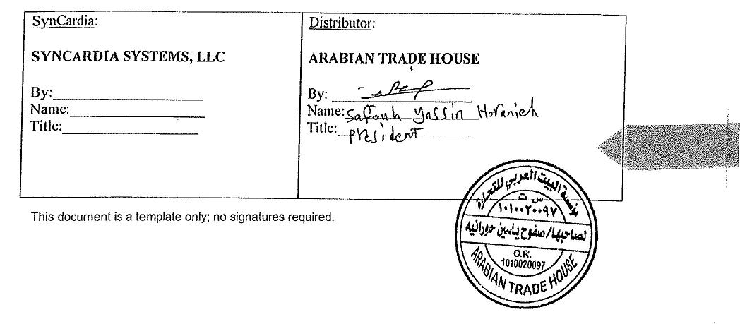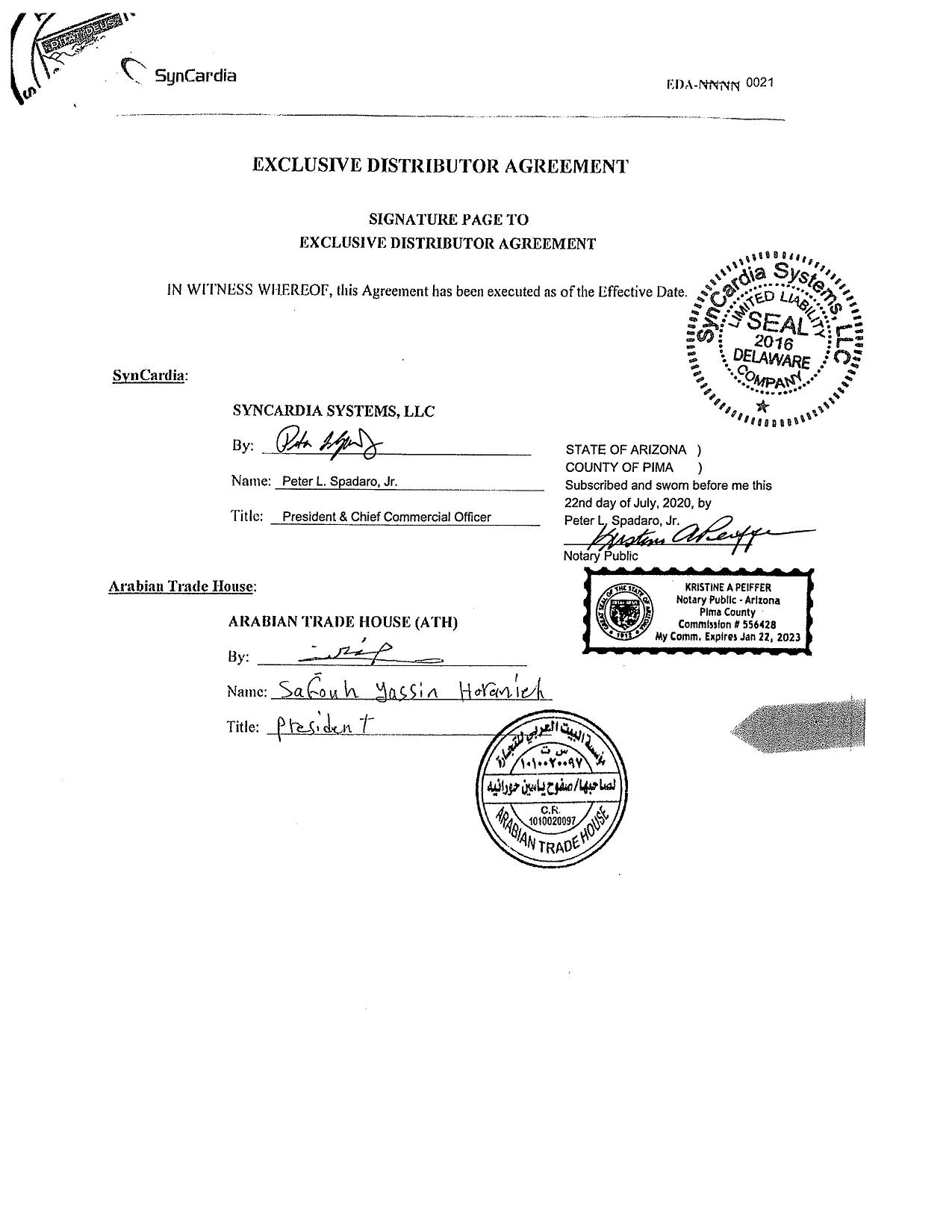 本加入独家分销协议(「加入协议」)自1St2020年7月(“合并生效日期”),由(i)SynCardia Systems,LLC,一家根据特拉华州法律组建的有限责任公司,主要营业地为1992 East Silverlake Road,Tucson,AZ,85713,U.S.A.(“SynCardia”),(ii)Arabian Trade HOUSE(ATH),一家根据沙特阿拉伯法律组建的公司,主要营业地为ATH Building No.1732,Prince Ahmed Bin Abdul Aziz Road,King Fahd District,P.O. Box 6744,Riyadh 11452,Saudi Arabia。
