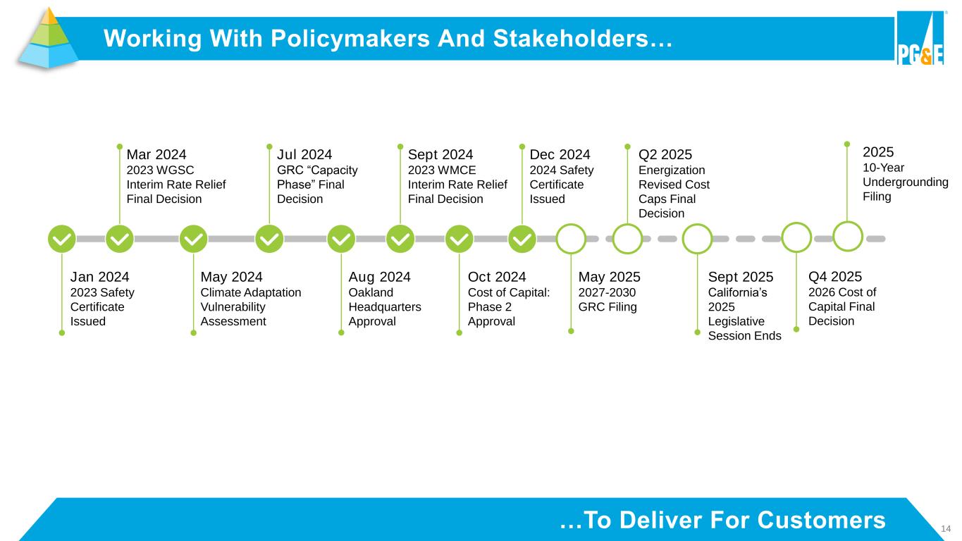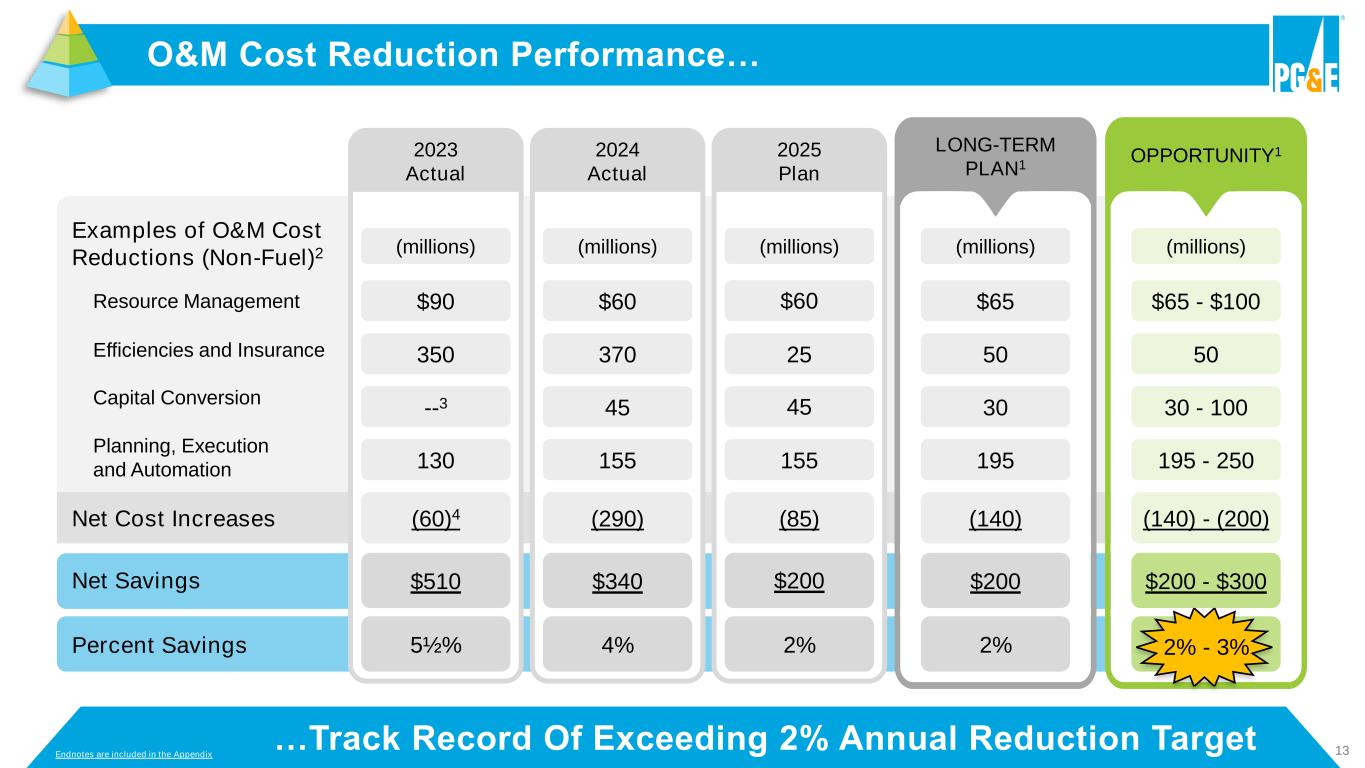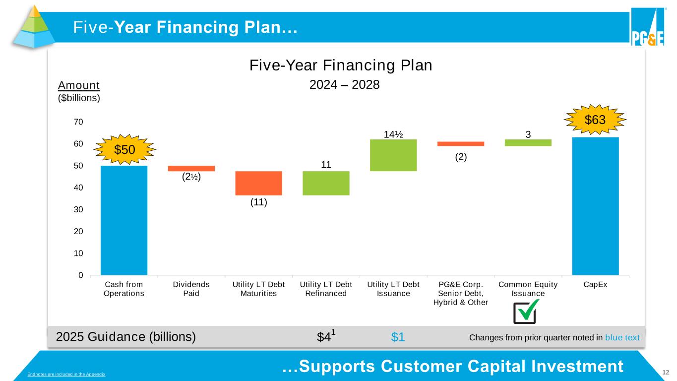 12…支持客户资本投资五年期融资计划…(2 ½)(11)113010203040506070运营现金支付的股息公用事业长期债务到期公用事业长期债务再融资公用事业长期债务发行太平洋煤气和电力 Corp.高级债务、混合和其他普通股发行资本支出50美元63美元金额(十亿美元)2024 – 2028五年期融资计划14 ½(2)尾注包含在附录中41美元12025指导(十亿)与上一季度的变化以蓝色文本注明