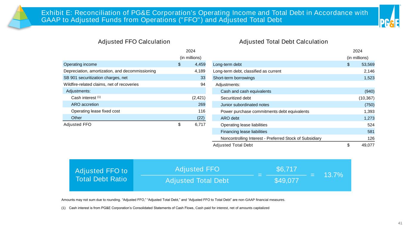 41 附件 C:太平洋煤气和电力公司 2024年盈利指引图表E:太平洋煤气和电力公司按照GAAP的营业收入和总债务与调整后运营资金(“FFO”)和调整后总债务的对账2024年(百万)营业收入4,459美元折旧、摊销和退役4,189 SB 901证券化费用,净额33与野火相关的债权,净额追偿94调整:现金利息(1)(2,421)ARO增值269经营租赁固定成本116其他(22)调整后FFO 6,7172024年(百万)长期债务53,569美元长期债务,分类为流动2,146短期借款1,523调整:现金及现金等价物(940)证券化债务(10,367)初级次级票据(750)电力购买承诺债务等价物1,393 ARO债务1,273经营租赁负债524融资租赁负债581非控股权益-子公司优先股126调整后总债务49,077美元调整后FFO计算调整后总债务计算调整后FFO = 6,717美元= 13.7%调整后总债务49,077美元调整后FFO与总债务比率金额可能因四舍五入而不相加。“调整后的FFO”、“调整后的总债务”和“调整后的FFO与总债务”是非公认会计准则财务指标。(1)现金利息来自太平洋煤气和电力公司合并现金流量表,支付利息的现金,扣除资本化金额