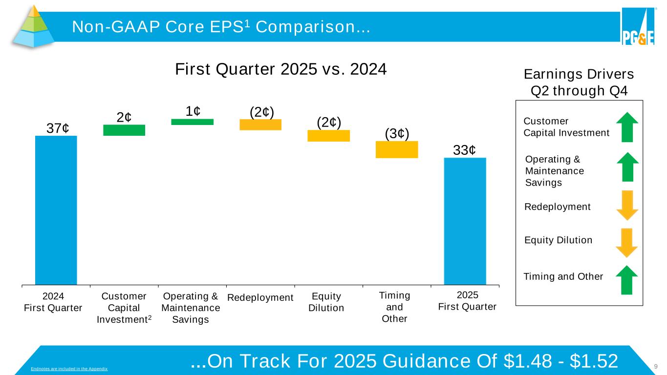 9非美国通用会计准则核心每股盈利1比较..。尾注包含在附录收益驱动因素Q2至Q4客户资本投资运营和维护节省重新部署33美分1美分(3美分)(2美分)2025年第一季度与2024年股权稀释2025年第一季度2024年第一季度客户资本投资2重新部署2美分37美分时机和其他运营和维护节省时间和其他股权稀释(2美分)…有望实现2025年1.48美元至1.52美元的指导尾注包含在附录中