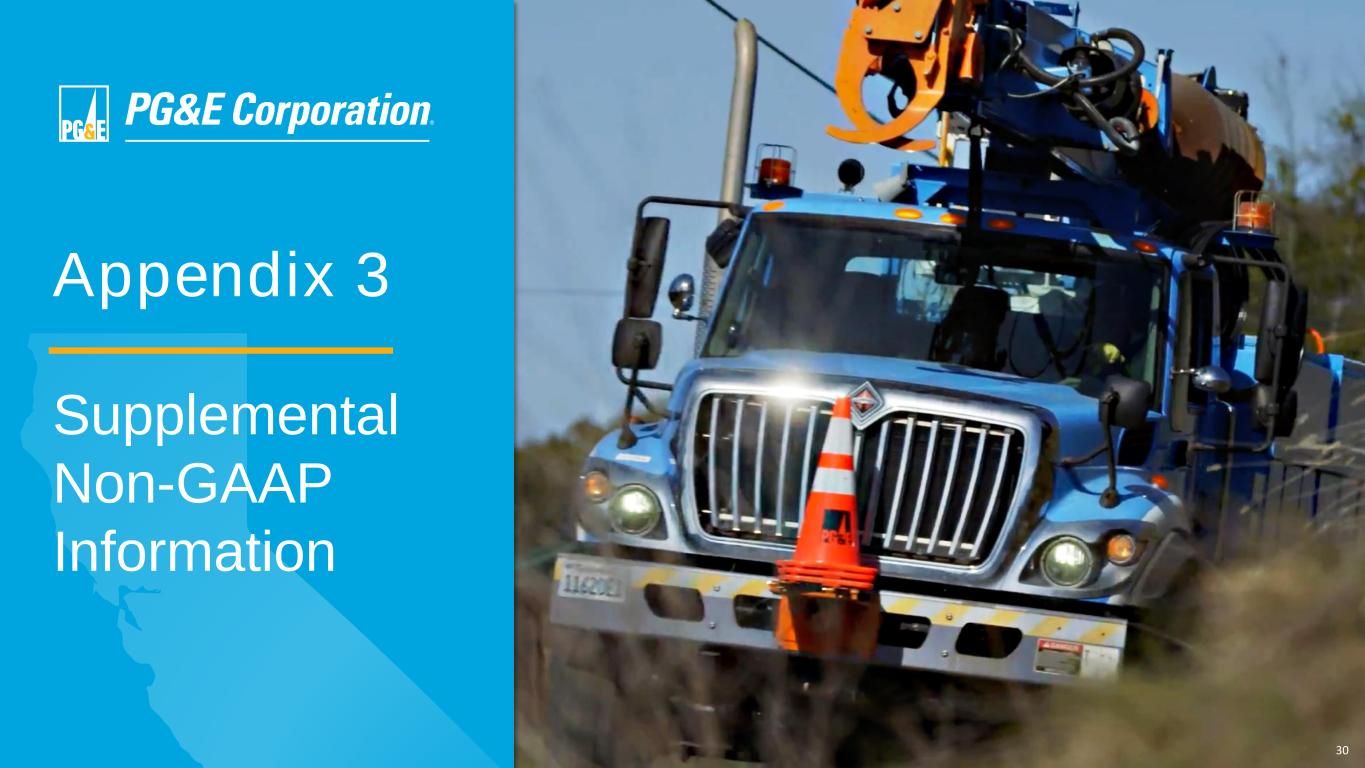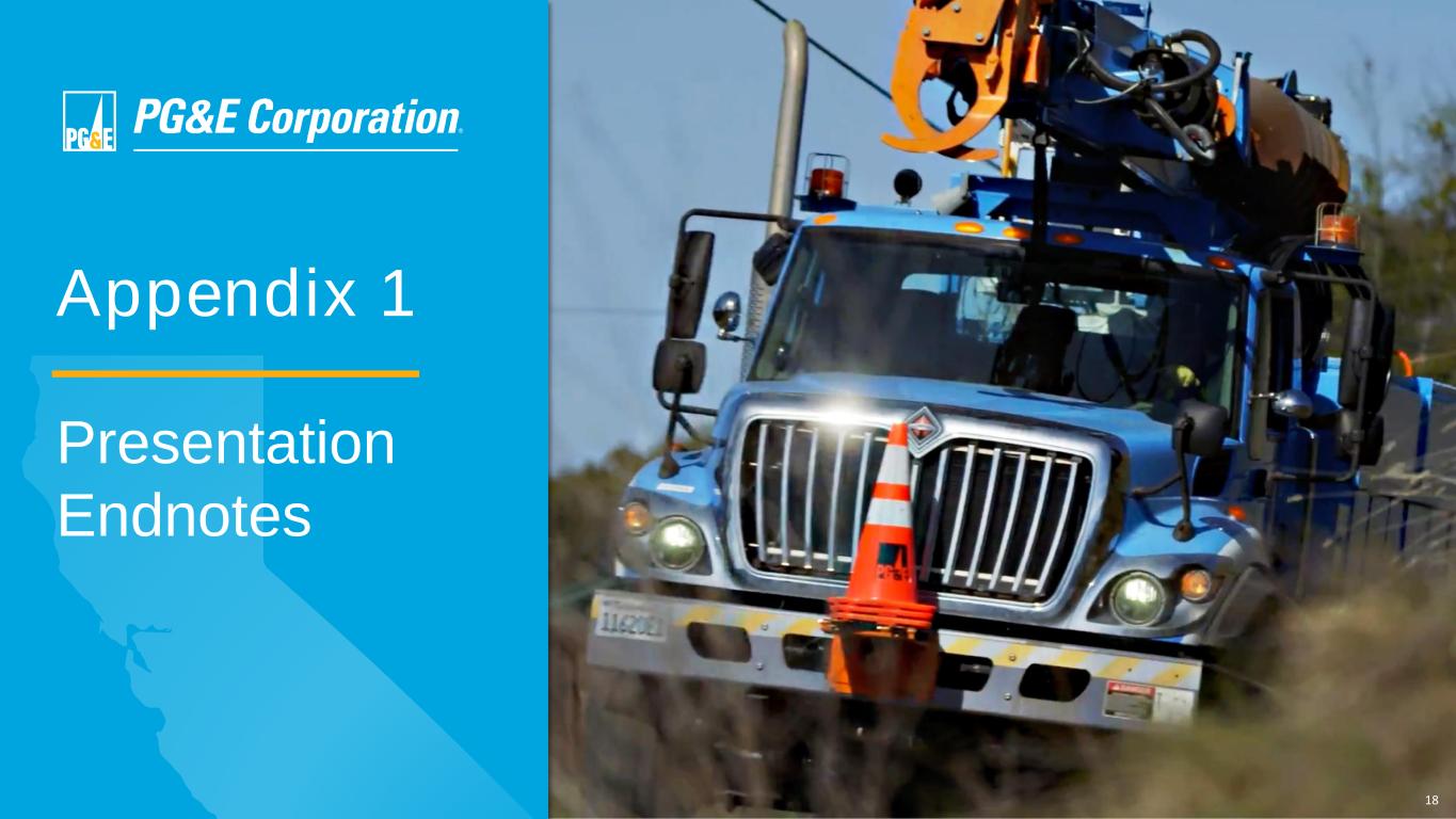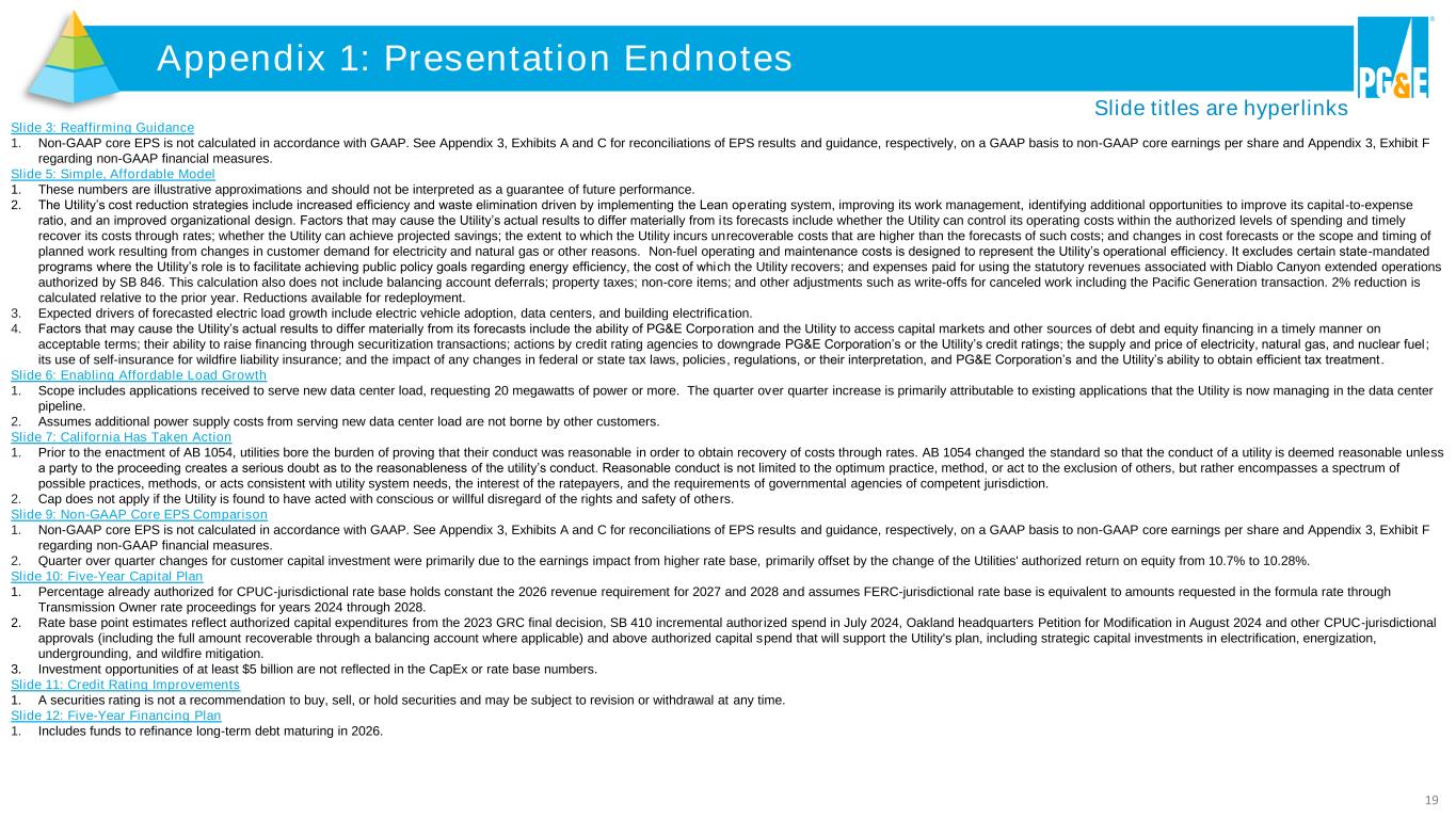 19附录1:演示文稿尾注幻灯片3:重申指导1。非美国通用会计准则核心每股收益不按照美国通用会计准则计算。参见附录3,图表A和C,分别了解基于GAAP的EPS结果和指引与非GAAP核心每股收益的对账情况,以及有关非GAAP财务指标的附录3,附件 F。幻灯片5:简单、实惠的Model 1。这些数字是说明性的近似值,不应被解释为对未来业绩的保证。2.公用事业公司的成本削减战略包括通过实施精益运营系统、改进其工作管理、确定更多机会以改善其资本费用比以及改进组织设计来提高效率和消除浪费。可能导致公用事业公司的实际结果与IT预测存在重大差异的因素包括,公用事业公司是否能够将其运营成本控制在授权的支出水平内,并通过费率及时收回成本;公用事业公司是否能够实现预计的节省;公用事业公司产生高于此类成本预测的不可收回成本的程度;以及由于客户对电力和天然气的需求变化或其他原因导致的成本预测或计划工作的范围和时间的变化。非燃料运营和维护成本旨在代表公用事业公司的运营效率。它不包括某些国家规定的项目,其中公用事业公司的作用是促进实现有关能源效率的公共政策目标,公用事业公司收回其成本;以及使用SB 846授权的与暗黑破坏神峡谷扩展运营相关的法定收入所支付的费用。这一计算也不包括平衡账户延期;财产税;非核心项目;以及包括太平洋发电交易在内的已取消工作的注销等其他调整。与上一年相比减少2%。可用于重新部署的削减。3.预计电力负荷增长的预期驱动因素包括电动汽车采用、数据中心和建筑电气化。4.可能导致公用事业公司的实际结果与其预测存在重大差异的因素包括:太平洋煤气和电力公司和公用事业公司以可接受的条款及时进入资本市场和其他债务和股权融资来源的能力;它们通过证券化交易筹集资金的能力;信用评级机构下调太平洋煤气和电力公司或公用事业公司信用评级的行动;电力、天然气和核燃料的供应和价格;其使用野火责任保险的自我保险;以及联邦或州税法、政策的任何变化的影响,法规,或其解释,以及太平洋煤气和电力公司和公用事业公司获得有效税务处理的能力。幻灯片6:启用负担得起的负载增长1。范围包括收到的为新的数据中心负载服务的申请,请求20兆瓦或更多的功率。环比增长主要归因于公用事业公司现在在数据中心管道中管理的现有应用程序。2.假设服务新数据中心负载产生的额外供电成本不由其他客户承担。幻灯片7:加州已采取行动1。在AB 1054颁布之前,公用事业公司承担了证明其行为合理的责任,以便通过费率获得成本回收。AB 1054修改了标准,以使公用事业的行为被视为合理,除非程序的一方对公用事业行为的合理性产生严重怀疑。合理行为并不局限于最佳做法、方法或排除他人的行为,而是包含一系列可能的做法、方法或行为,这些做法、方法或行为与公用事业系统的需要、纳税人的利益以及主管司法管辖的政府机构的要求相一致。2.如果发现公用事业公司有意识或故意无视他人权利和安全的行为,则上限不适用。幻灯片9:Non-GAAP核心EPS比较1。非GAAP核心EPS不按照GAAP计算。参见附录3,图表A和C,分别了解基于GAAP的EPS结果和指引与非GAAP核心每股收益的对账情况,以及有关非GAAP财务指标的附录3,附件 F。2.客户资本投资的季度环比变化主要是由于更高的费率基数带来的收益影响, 主要被公用事业公司的法定股本回报率从10.7%改为10.28%所抵销。幻灯片10:五年资本计划1。已授权给CPU的百分比-管辖性费率基数与2027年和2028年的2026年收入要求保持不变,并假设FERC-管辖性费率基数相当于2024年至2028年通过传输所有者费率程序在公式费率中要求的金额。2.费率基点估计数反映了2023年GRC最终决定的授权资本支出、2024年7月SB 410增量授权支出、2024年8月奥克兰总部的修改申请和其他CPU管辖批准(包括可通过适用的平衡账户收回的全额)以及将支持公用事业公司计划的高于授权的资本支出,包括在电气化、通电、地下和野火缓解方面的战略资本投资。3.至少50亿美元的投资机会没有反映在资本支出或利率基数上。幻灯片11:信用评级改进1。证券评级不是买入、卖出或持有证券的建议,随时可能被修改或撤回。幻灯片12:五年融资计划1。包括为2026年到期的长期债务再融资的资金。幻灯片标题是超链接
