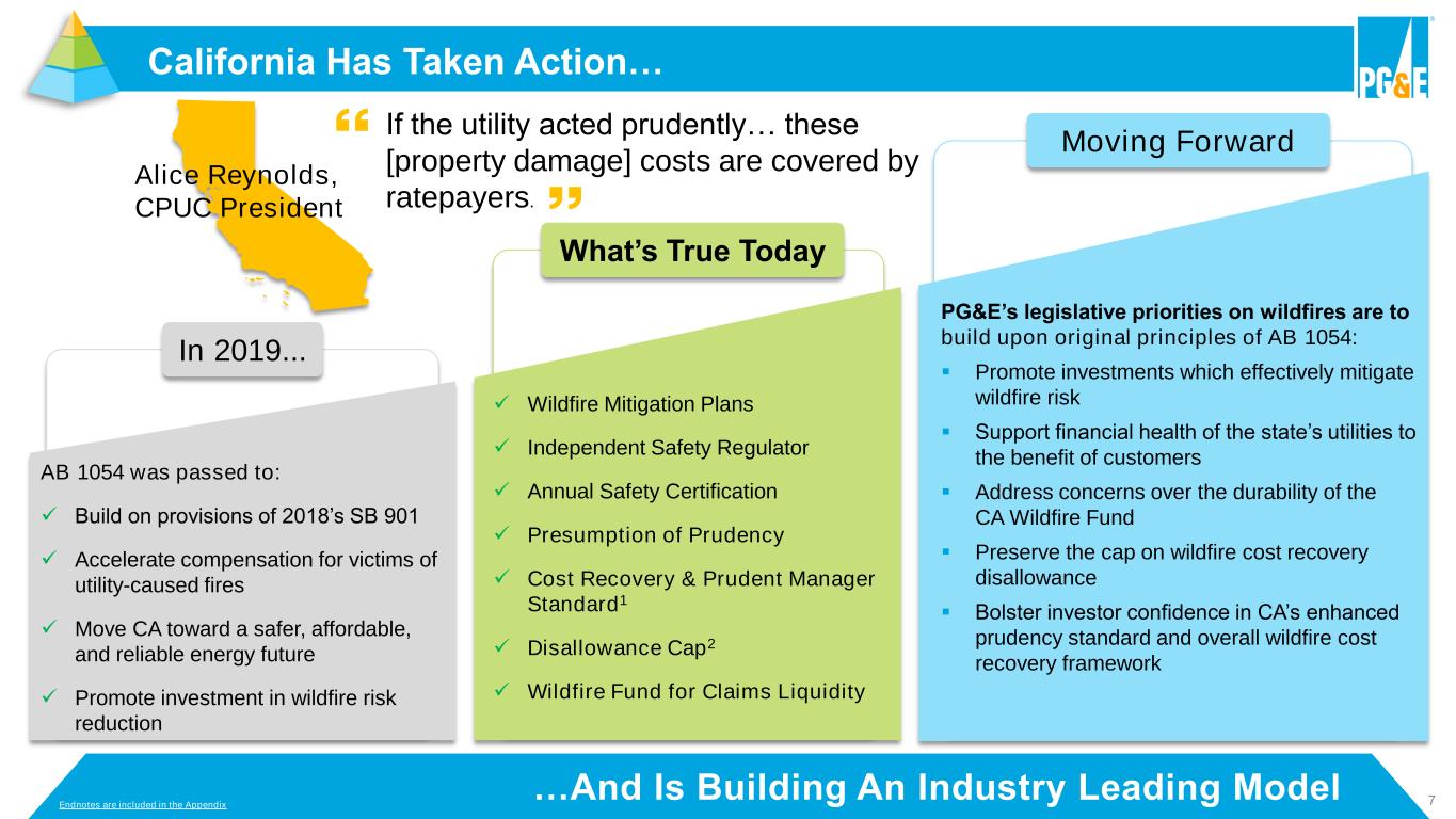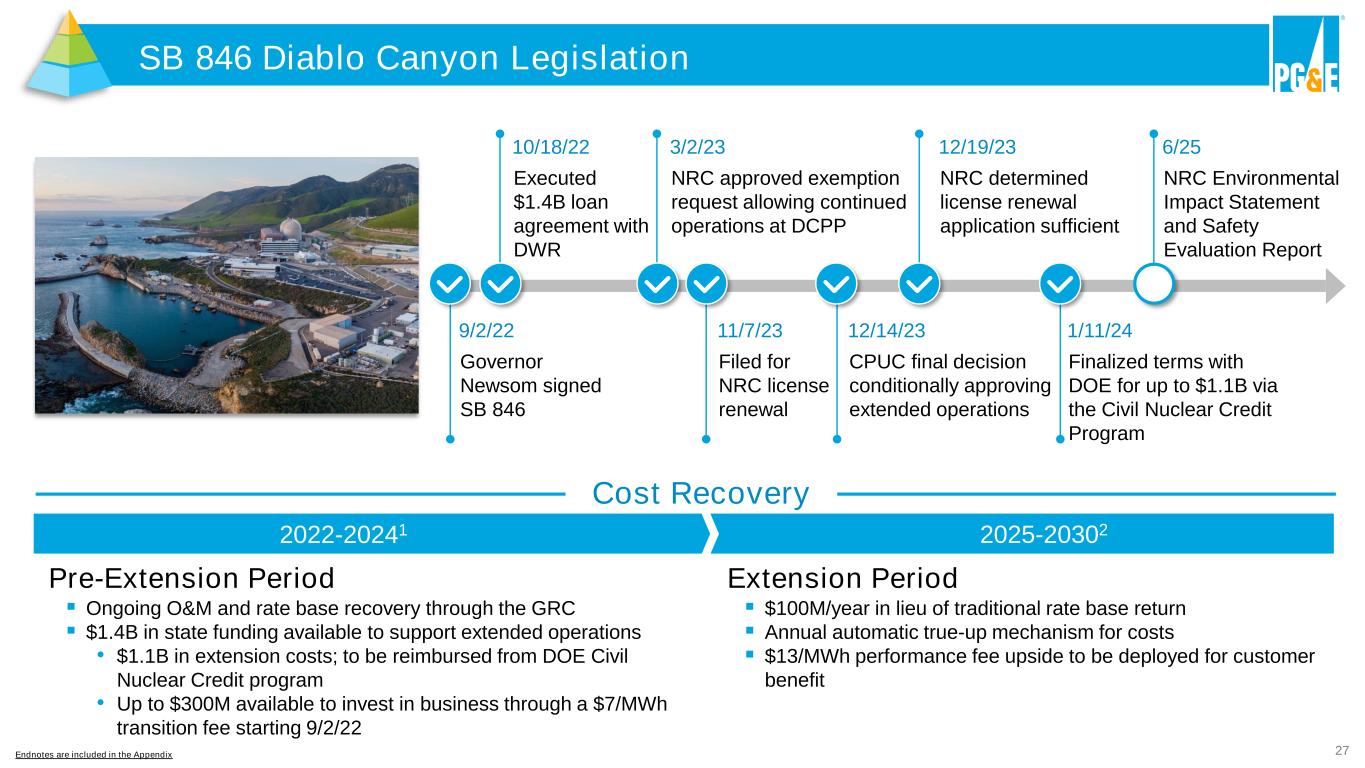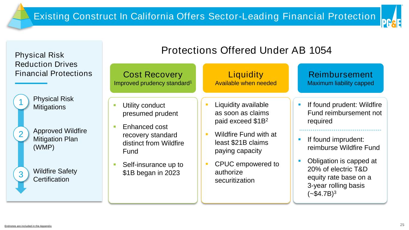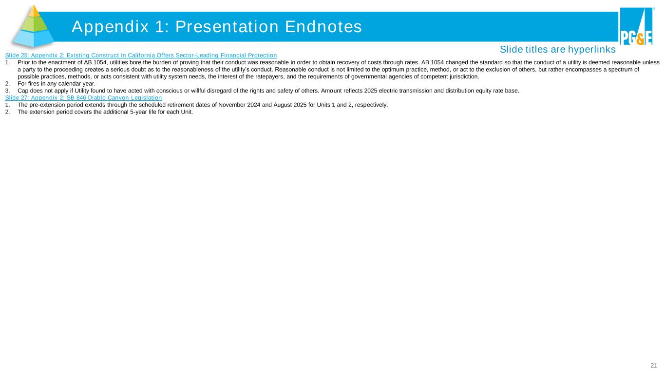 21附录1:演示文稿尾注幻灯片标题为超链接幻灯片25:附录2:加利福尼亚州现有的构造提供行业领先的财务保护1。在AB 1054颁布之前,公用事业公司承担了证明其行为合理的责任,以便通过费率获得成本回收。AB 1054修改了标准,以使公用事业的行为被视为合理,除非程序的一方对公用事业行为的合理性产生严重怀疑。合理行为并不局限于最佳做法、方法或排除他人的行为,而是包含一系列可能的做法、方法或行为,这些做法、方法或行为与公用事业系统的需要、纳税人的利益以及主管司法管辖的政府机构的要求相一致。2.适用于任何日历年的火灾。3.发现公用事业公司有意识或故意漠视他人权利和安全的,上限不适用。金额反映2025年输配电权益费率基数。幻灯片27:附录2:SB 846《暗黑破坏神峡谷立法》1。预延长期延长至1号和2号机组分别预定的2024年11月和2025年8月退役日期。2.延长期涵盖每个单位额外的5年寿命。
