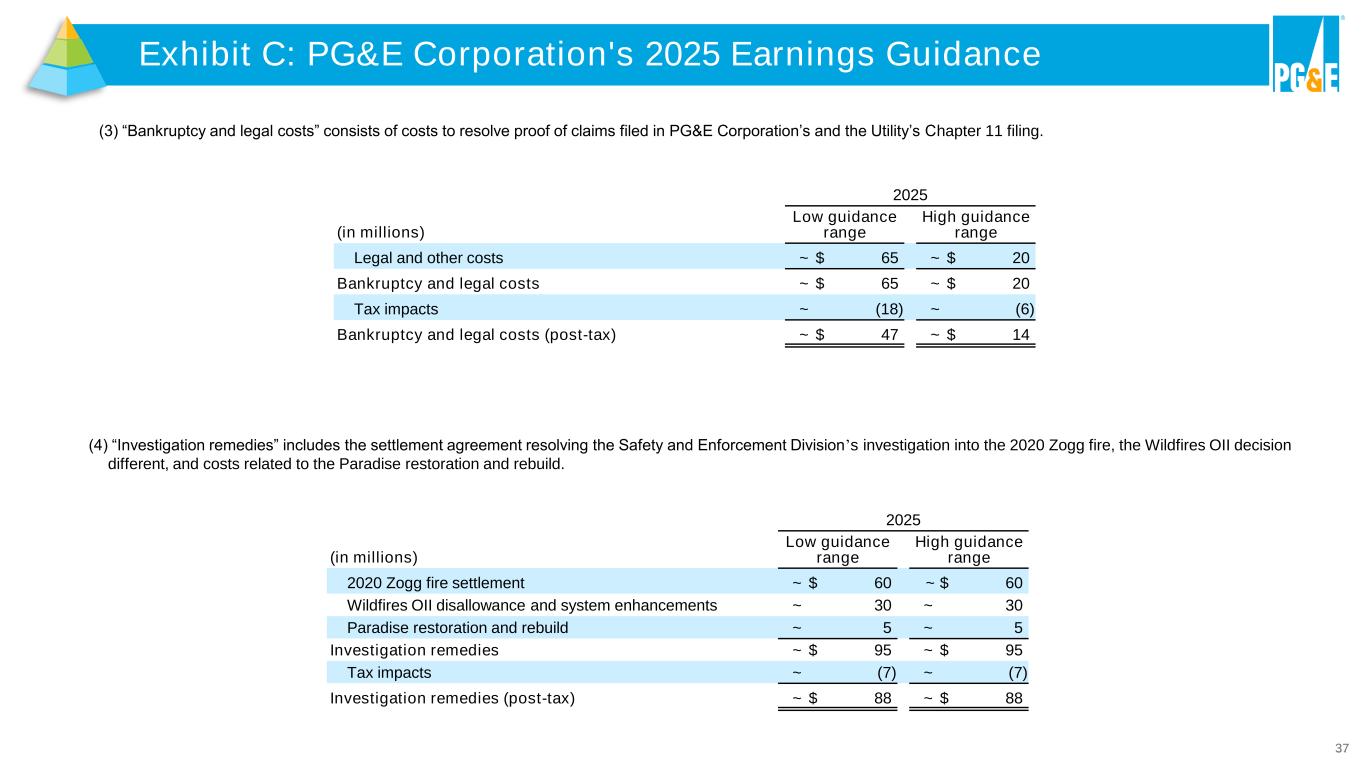 37 附件 E:太平洋煤气和电力公司的2020年和2021年收益指导(3)“破产和法律费用”包括解决在太平洋煤气和电力公司和公用事业公司第11章备案的索赔证明的费用。2025年(百万)低指导范围高指导范围法律和其他费用~65美元~20美元破产和法律费用~65美元~20美元税收影响~(18)~(6)破产和法律费用(税后)~47美元~14美元附件 C:太平洋煤气和电力公司的2024年盈利指引C:太平洋煤气和电力 Corporation的205盈利指引(4)“调查补救措施”包括解决安全和执法部门对2020年Zogg火灾调查的和解协议、野火OII决定不同以及与天堂恢复和重建相关的费用。2025年(百万)低指导范围高指导范围2020年Zogg火灾和解~60美元~60美元野火OII不允许和系统增强~30~30天堂恢复和重建~5~5调查补救措施~95美元~95美元税收影响~(7)~(7)调查补救措施(税后)~88美元~88美元