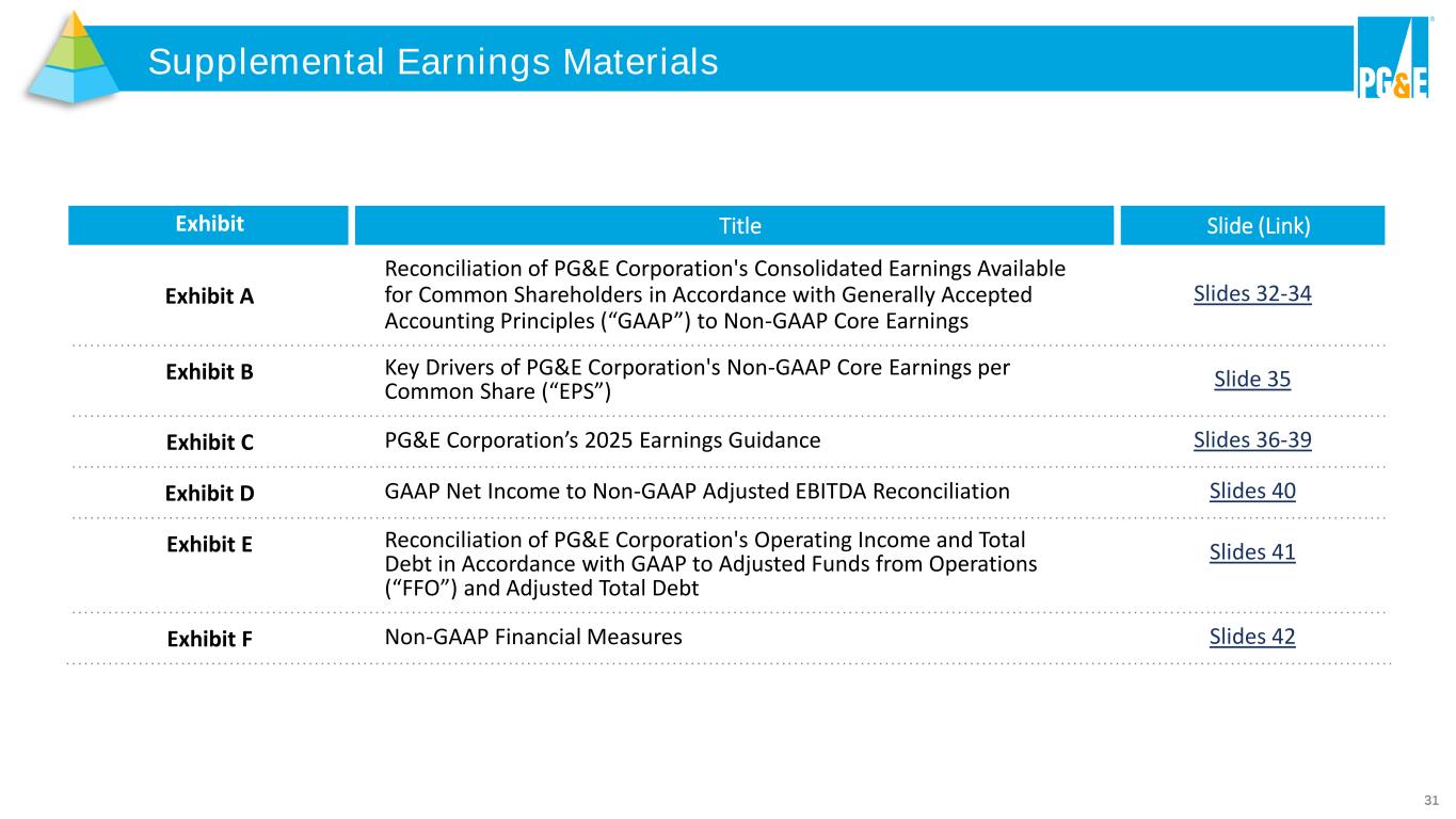 31补充收益材料附件标题幻灯片(链接)附件 A 太平洋煤气和电力公司根据公认会计原则(“GAAP”)可供普通股股东使用的合并收益与非GAAP核心收益幻灯片的对账32-34 附件 B 太平洋煤气和电力公司非GAAP核心每股普通股收益(“EPS”)的关键驱动因素幻灯片35 附件 C 太平洋煤气和电力公司 2025年盈利指导幻灯片36-39 附件 D GAAP净收入与非GAAP调整后EBITDA的对账幻灯片40 附件 E 太平洋煤气和电力公司的营业收入和总债务按照GAAP与调整后运营资金的对账(“和调整后的总债务下滑41 附件 F非公认会计准则财务指标下滑42