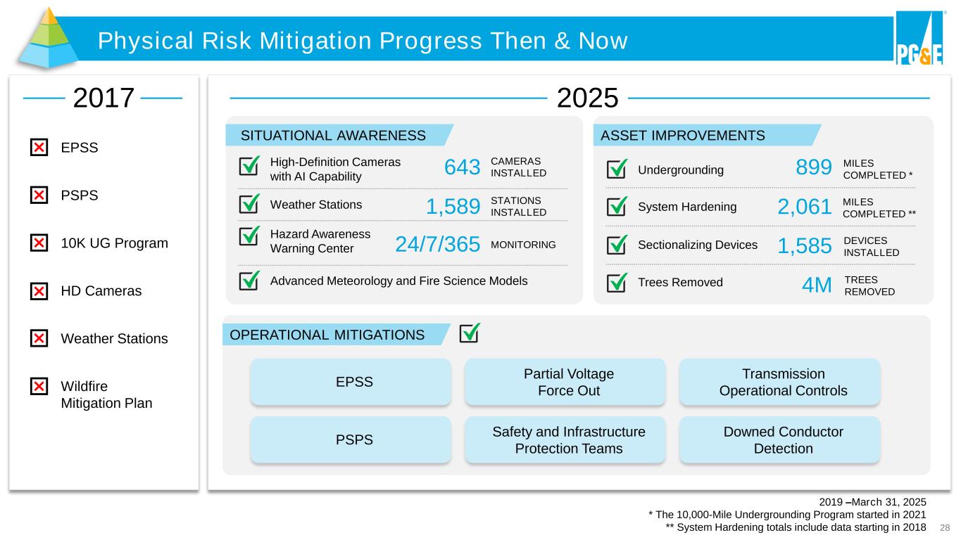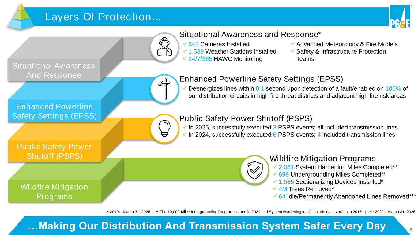 8个野火缓解方案…让我们的配电和输电系统更安全每一天层层保护..。公共安全断电(PSPS)增强型电力线安全设置(EPSS)野火缓解方案丨完成2,061个系统强化里程**︱完成899个地下里程**︱已安装1,585个分段化装置*丨4米树木被移除*丨64条闲置/永久废弃线路被移除***增强型电力线安全设置(EPSS)丨在检测到故障后0.1秒内断电/在高火灾威胁区和邻近高火灾风险区公共安全断电(PSPS)的我们的配电电路上100%启用丨2025年,成功执行3次PSPS事件;全部包括输电线路丨2024年,成功执行6个PSPS事件;4个包含输电线路态势感知与响应*丨装643个摄像头丨装1589个气象站丨24/7/365 HAWC监测丨先进的气象和消防模型丨安全和基础设施保护团队态势感知和响应*2019 – 2025年3月31日|**2021年开始的万里地下计划和系统硬化总数包括2018年开始的数据|***2022 – 2025年3月31日