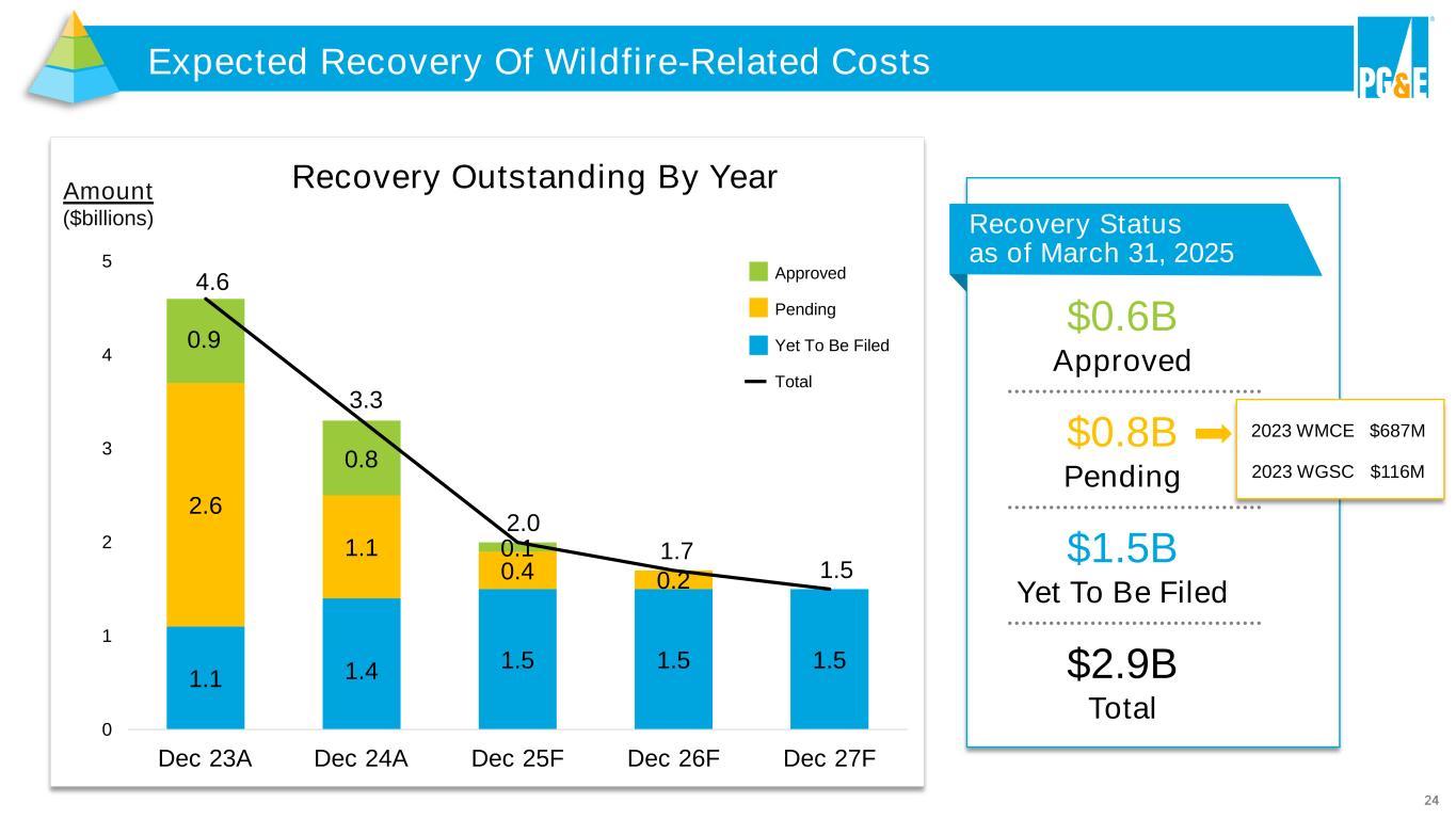 24预计收回与野火有关的费用未偿还的年份1.1 1.4 1.5 1.5 1.5 2.6 1.10.4 0.2 0.9 0.8 0.14.6 3.3 2.0 1.7 1.50 1234512月23日A 12月24日A 12月25日F 12月26日F 12月27日F批准待决尚未提交的总金额(十亿美元)截至2025年3月31日$ 0.6B批准的恢复状态$ 0.8B待决$ 1.5B尚未提交$ 2.9B总计2023 WMCE $ 6.87亿2023 WGSC $ 1.16亿