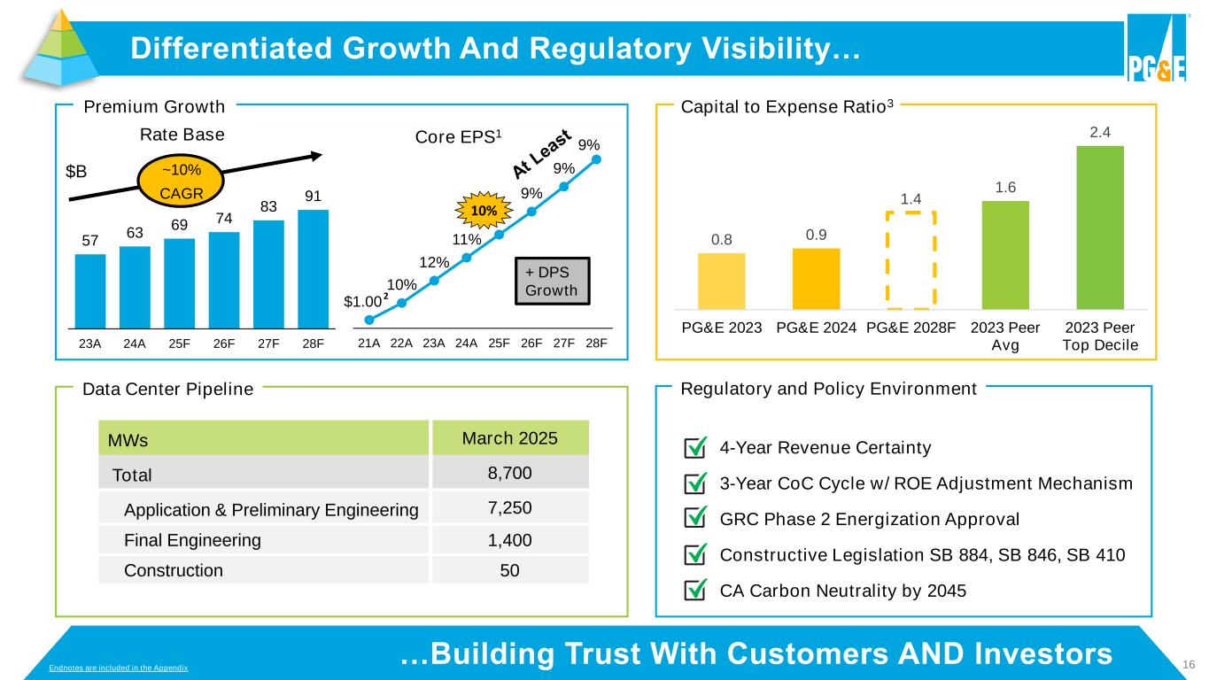 15…惠及客户和投资者的差异化表现…2023A 2024A 2025F未来客户投资率基数增长14.5% 10.5% 9.5% 加利福尼亚州监管排名(RRA)平均/1平均/1平均/1高于平均水平的可负担得起的型号非燃料运维减少1 5 ½ %4% 2% 2%负荷增长2客户账单3信用评级BB-/ba2 BB/ba1十几岁FFO/debt6一致表现非公认会计准则核心每股收益增长4 12% 11% 10%至少9% 2026-2028年经营现金流$ 4.7B $ 8.0B $ 9B $ 10B +风险降低安全认证有效期至12/11/25财务共同股息/火灾受害者信托退出股票发行/股息指导1%-3% 2%-4%更强的估值210级尾注包含在附录中
