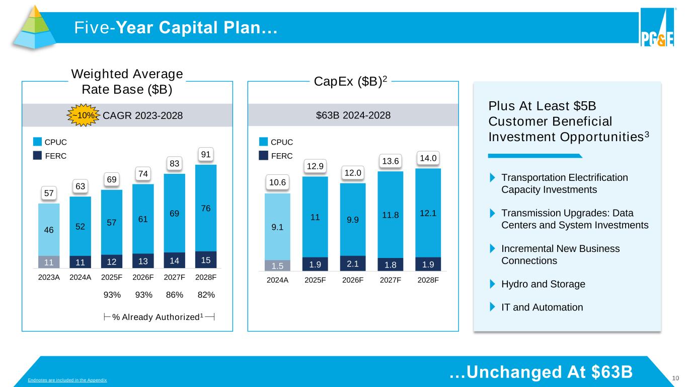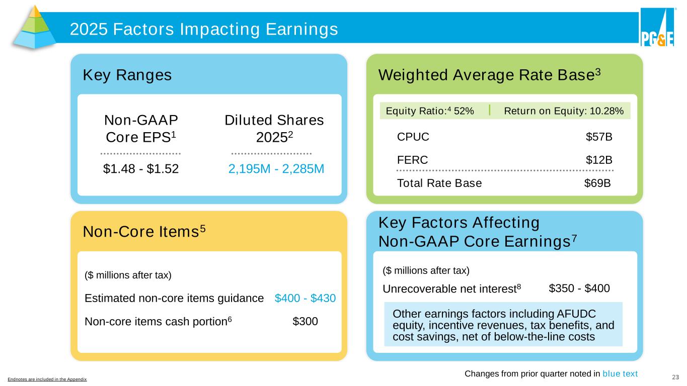 232025年影响收益尾注的因素包含在附录中$ 1.48-$ 1.52非GAAP核心每股收益1稀释股份2025221.95亿-22.85亿关键区间加权平均费率Base3 CPUC $ 57B FERC $ 12B总费率基数$ 69B股权比率:452%股本回报率:10.28%非核心项目5影响非GAAP核心收益的关键因素7(税后百万美元)估计非核心项目指引$ 400-$ 430非核心项目现金部分6 $ 300(税后百万美元)不可收回的净利息8 $ 350-$ 400其他收益因素,包括AFUDC股权、激励收入、税收优惠和成本节约,扣除线下成本后的净额与上一季度相比的变化以蓝色文字表示
