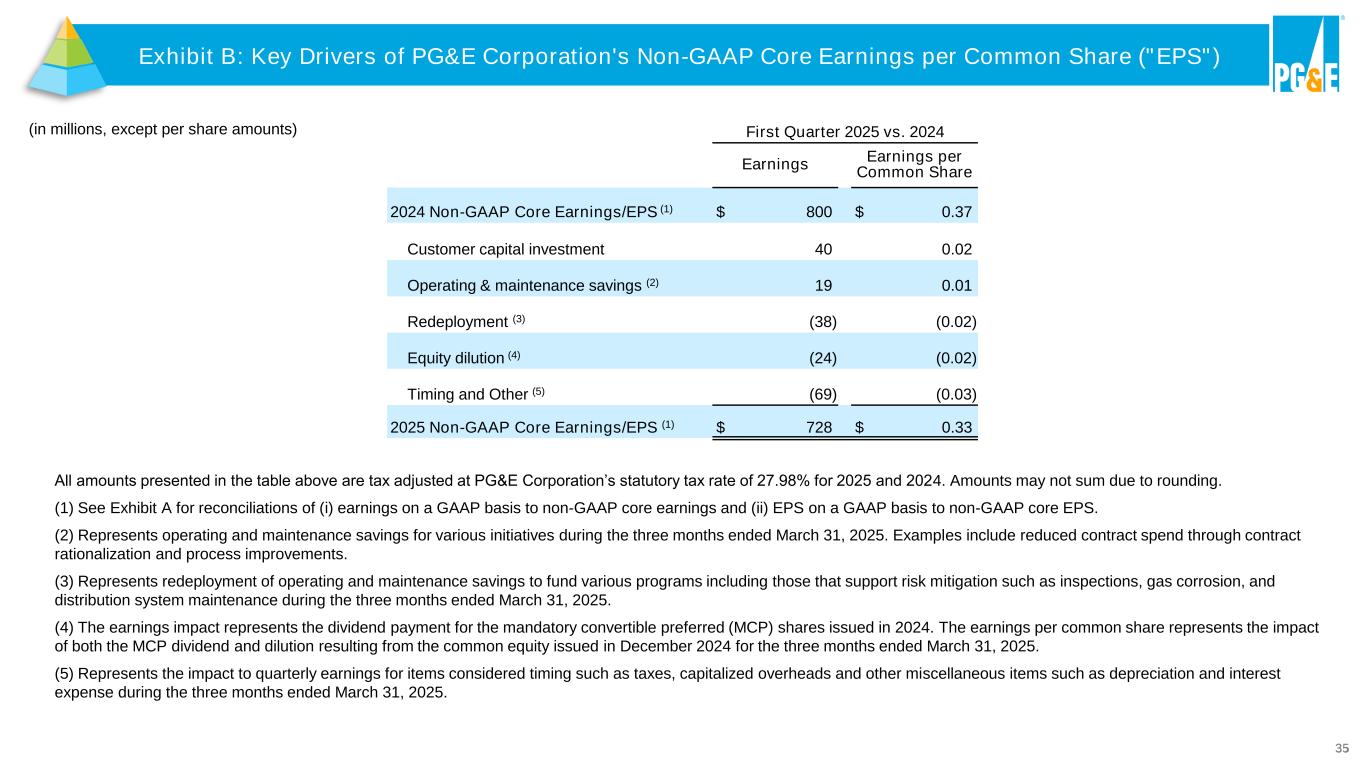 35上表所列所有金额均按2025年和2024年太平洋煤气和电力公司的法定税率27.98%进行了税收调整。由于四舍五入,金额可能不相加。(1)有关(i)基于GAAP的收益与非GAAP核心收益以及(ii)基于GAAP的每股收益与非GAAP核心每股收益的对账,请参见附件 A。(2)代表截至2025年3月31日止三个月内各项举措的运营和维护节省。例子包括通过合同合理化和流程改进减少合同支出。(3)表示在截至2025年3月31日的三个月内,将营运及维修节省重新部署以资助各种计划,包括支持风险缓解的计划,例如检查、气体腐蚀和分配系统维护。(4)盈利影响指2024年发行的强制性可转换优先(MCP)股票的股息支付。每股普通股收益代表截至2025年3月31日止三个月的2024年12月发行的普通股产生的MCP股息和稀释的影响。(5)表示对截至2025年3月31日止三个月的税项、资本化间接费用等被视为时间项目以及折旧和利息费用等其他杂项的季度收益的影响。2025年第一季度与2024年每股普通股收益2024年非美国通用会计准则核心收益/EPS(1)800美元0.37美元客户资本投资400.02运营和维护节省(2)190.01重新部署(3)(38)(0.02)股权稀释(4)(24)(0.02)时机和其他(5)(69)(0.03)2025年非美国通用会计准则核心收益/EPS(1)728美元0.33美元(以百万计,每股金额除外)附件 B:太平洋煤气和电力公司非美国通用会计准则核心每股普通股收益(“EPS”)的主要驱动因素太平洋煤气和电力公司的非美国通用会计准则核心每股普通股收益(“EPS”)