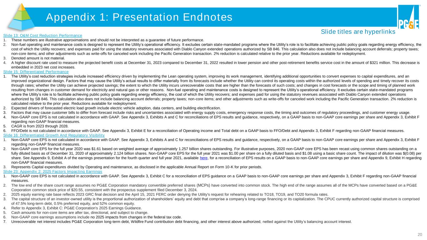20附录1:演示文稿尾注幻灯片标题为超链接幻灯片13:O & M成本降低性能1。这些数字是说明性的近似值,不应被解释为对未来业绩的保证。2.非燃料运营和维护成本旨在代表公用事业公司的运营效率。它不包括某些国家规定的项目,其中公用事业公司的作用是促进实现有关能源效率的公共政策目标,成本由公用事业公司收回;以及使用SB 846授权的与暗黑破坏神峡谷扩展运营相关的法定收入所支付的费用。这一计算也不包括平衡账户延期;财产税;非核心项目;以及其他调整,例如注销包括太平洋发电交易在内的已取消工作。相对于上一年计算减少2%。可用于重新部署的削减。3.表示的金额并不重要。4.与2022年12月31日相比,用于衡量2023年12月31日预计福利成本的贴现率较高,导致养老金和其他退休后福利服务成本较低,金额为3.21亿美元。这一减少体现在2023年净成本增加中。幻灯片15:差异化性能1。公用事业公司的成本削减战略包括通过实施精益操作系统来提高效率、改进其工作管理、确定将费用转换为资本支出的额外机会以及改进组织设计。可能导致公用事业公司的实际结果与其预测存在重大差异的因素包括,公用事业公司是否能够将其运营成本控制在授权的支出水平范围内,并通过费率及时收回成本;公用事业公司是否能够实现预计的节约;公用事业公司在多大程度上产生了高于此类成本预测的不可收回成本;以及由于客户对电力和天然气的需求变化或其他原因导致的成本预测或计划工作范围和时间的变化。非燃料运营和维护成本旨在代表公用事业公司的运营效率。它不包括某些国家规定的项目,其中公用事业公司的作用是促进实现有关能源效率的公共政策目标,公用事业公司收回这些目标的成本;以及使用SB 846授权的与暗黑破坏神峡谷扩展运营相关的法定收入所支付的费用。这一计算也不包括平衡账户延期;财产税;非核心项目;以及其他调整,例如注销包括太平洋发电交易在内的已取消工作。相对于上一年计算减少2%。可用于重新部署的削减。2.预计电力负荷增长的预期驱动因素包括电动汽车采用、数据中心和建筑电气化。3.可能导致客户账单与预测不同的因素包括与能源供应成本、应急响应成本、监管程序的时间和结果以及客户能源使用相关的风险和不确定性。4.非GAAP核心EPS不按照GAAP计算。参见附录3,图表A和C,分别了解基于GAAP的EPS结果和指引与非GAAP核心每股收益的对账情况,以及有关非GAAP财务指标的附录3,附件 F。5.复合年增长率为2023年至2028年。6.FFO/债务不按照公认会计原则计算。有关非GAAP财务指标的营业收入和总债务在GAAP基础上与FFO/债务的对账,请参见附录3,附件 E,以及有关非GAAP财务指标的附录3,附件 F。幻灯片16:差异化增长和监管可见度1。非GAAP核心EPS不按照GAAP计算。参见附录3,图表A和C,分别了解基于GAAP的EPS结果和指引与非GAAP核心每股收益的对账情况,以及有关非GAAP财务指标的附录3,附件 F。2.2020年全年非美国通用会计准则核心每股收益为1.61美元,基于约12.57亿股流通股的加权平均。为说明目的,2020年非美国通用会计准则核心每股收益已使用截至2020年12月31日在完全稀释基础上已发行的普通股约21.24亿股进行重铸。2021年全年非美国通用会计准则核心每股收益在完全稀释的基础上为每股1.00美元,按基本股数计算为1.08美元。稀释的影响为每股(0.08)美元。请参阅此处提供的2021年第四季度和全年收益报告的附录9,附件 A,了解基于GAAP的每股收益结果与非GAAP核心每股收益的对账,以及有关非GAAP财务指标的附录9,附件 H。3.表示资本支出除以运营和维护, 正如先前期间适用的10-K表格年度报告所披露的那样。幻灯片23:附录2:影响收益的2025年因素1。非美国通用会计准则核心每股收益不按照美国通用会计准则计算。有关基于GAAP的每股收益指引与非GAAP核心每股收益的对账,请参见附录3,附件 C,以及有关非GAAP财务指标的附录3,附件 F。2.股票数量范围的低端假设没有太平洋煤气和电力公司强制性可转换优先股(MCP)转换为普通股。该区间的高端假设所有MCP的转换价格基于太平洋煤气和电力公司 20.55美元的普通股价格,这与2024年12月3日提交的招股说明书补充文件一致。2.2025年权益收益率基数反映了2023年GRC最终决定和2021年4月15日FERC命令,拒绝了公用事业公司有关TO18、TO19和TO20公式费率的重新听证请求。3.投资者拥有的公用事业公司的资本结构是对构成公司长期融资或其资本化的股东权益和债务的比例授权。CPUC目前的授权资本结构由47.5%的长期债务、0.5%的优先股和52%的普通股组成。4.参见附录3,附件 C:太平洋煤气和电力公司公司2025年盈利指引。5.非核心项目的现金金额是税后的、定向的,可能会发生变化。6.非美国通用会计准则核心收益假设不包括联邦税法变化对2025年的影响。7.无法收回的净利息包括长期债务、野火基金出资债务融资以及上述授权的其他利息,这些利息已从公用事业公司的余额账户利息中扣除。