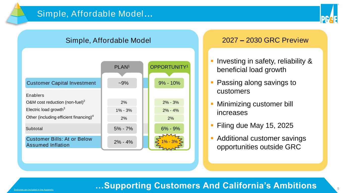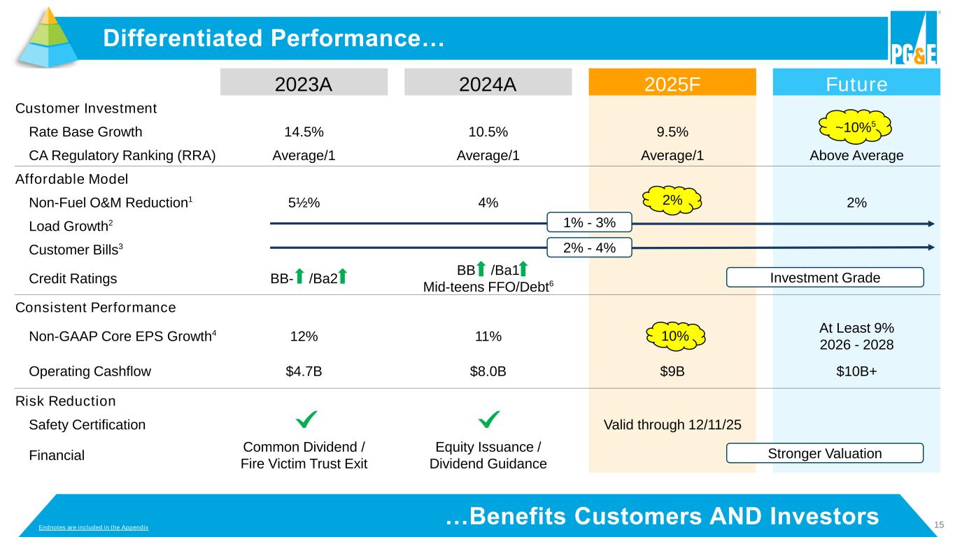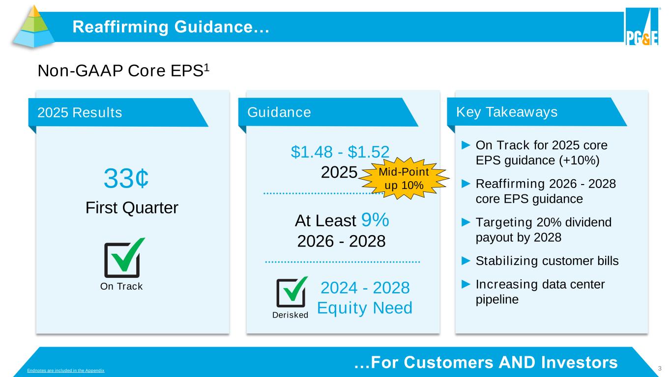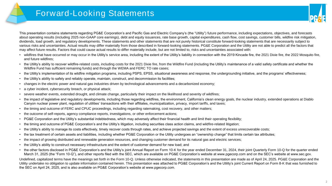 2本演示文稿包含有关太平洋煤气和电力公司和太平洋天然气和电力公司(“公用事业”)未来业绩的陈述,包括有关经营业绩(包括2025年非公认会计准则核心收益)、债务和股票发行、费率基数增长、资本支出、现金流、成本节约、客户账单、野火风险缓解、股息、负荷增长和监管发展的预期、目标和预测。这些陈述和其他并非纯粹历史性的陈述构成了前瞻性陈述,必然受到各种风险和不确定性的影响。实际结果可能与前瞻性陈述中描述的结果存在重大差异。太平洋煤气和电力公司和公用事业公司无法预测可能影响未来业绩的所有因素。可能导致实际结果出现重大差异的因素包括但不限于与以下相关的风险和不确定性:•公用事业公司服务区域内已经发生或可能发生的野火,包括公用事业公司与2019年Kincade火灾、2021年Dixie火灾、2022年蚊子火灾和未来野火相关的责任范围;•公用事业公司收回与野火相关的成本的能力,包括2021年Dixie火灾的成本,来自野火基金(包括公用事业公司维护有效的安全证书以及野火基金是否有足够的剩余资金)并通过WEMA和FERC对案例进行评级;•公用事业公司实施其野火缓解计划,包括PSPS、EPS、态势感知和响应、地下倡议以及计划的有效性;•公用事业公司安全可靠地运营、维护、建造和退役其设施的能力;•由技术进步和脱碳经济推动的电力和天然气行业的变化;•网络事件、网络安全漏洞,或物理攻击;•恶劣天气事件、持续干旱和气候变化,特别是它们对野火发生的可能性和严重程度的影响;•立法和监管发展的影响,包括与野火、环境、加州清洁能源目标、核工业、迪亚布洛峡谷核电站延长运营、监管公用事业公司与其附属公司的交易、市政、隐私、进口关税和税收有关的影响;• FERC和CPUC程序的时间安排和结果,包括有关费率制定、成本回收和其他事项;•自我报告、机构合规报告、调查的结果,或其他强制执行行动;• 太平洋煤气和电力公司和公用事业公司负债累累,这可能会对其财务状况产生不利影响并限制其经营灵活性;• 太平洋煤气和电力公司和公用事业公司诉讼(包括证券集体诉讼索赔以及与野火相关的诉讼)的时间和结果;•公用事业公司有效管理成本、通过费率及时收回成本并实现预计节省的能力以及超额无法收回成本的程度;•某些资产和负债的税务处理,包括太平洋煤气和电力公司或公用事业公司是否发生“所有权变更”从而限制了某些税收属性;•分布式和可再生发电资源不断增长的影响,以及客户对其天然气和电力服务的需求不断变化;•公用事业公司建设必要基础设施的能力以及客户对新负荷的需求程度;以及• TERM0和公用事业公司截至2024年12月31日止年度的联合10-K表格年度报告、其截至2025年3月31日止季度的联合季度10-Q表格(“10-Q表格”)中披露的其他因素,以及向SEC提交的其他报告,可在太平洋煤气和电力公司的网站www.pgecorp.com和SEC的网站www.sec.gov上查阅。未定义的大写术语具有表格10-Q中规定的含义。除非另有说明,本演示文稿中的陈述截至2025年4月24日。太平洋煤气和电力公司和公用事业公司不承担更新此处包含的信息的义务。此演示文稿附在太平洋煤气和电力公司和公用事业公司于2025年4月24日向SEC提供的关于表格8-K的联合当前报告中,也可在太平洋煤气和电力公司的网站www.pgecorp.com上查阅。前瞻性陈述