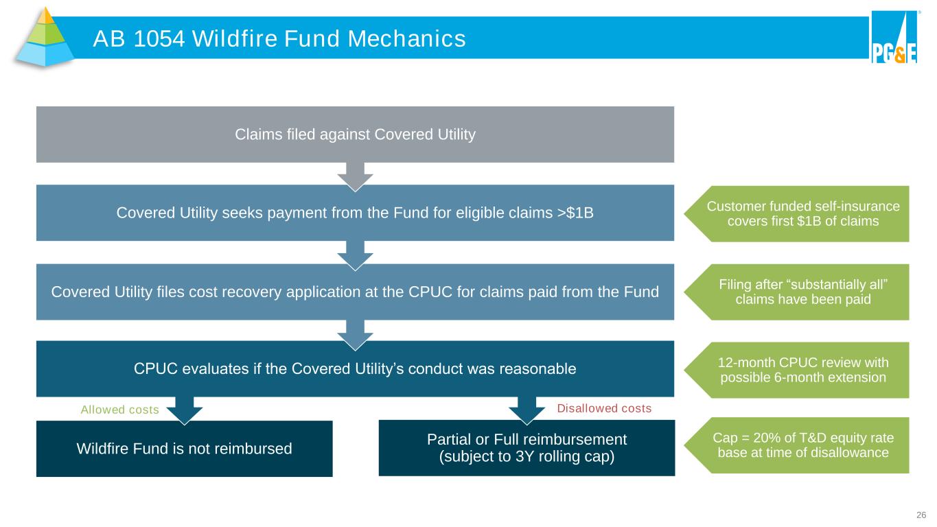 Public 26 AB 1054 Wildfire Fund Mechanics Wildfire Fund未获偿付部分或全部偿付(受制于3年滚动上限)CPUC评估涵盖公用事业的行为是否合理涵盖公用事业就从基金涵盖的基金支付的索赔向CPUC提交成本回收申请Utility寻求基金就符合条件的索赔支付> $ 1b不允许的成本允许的成本在“几乎所有”索赔都已支付12个月CPUC审查并可能延长6个月后针对涵盖的公用事业备案提出的索赔客户资助的自保涵盖索赔的前$ 1B索赔上限=不允许时T & D权益费率基数的20%