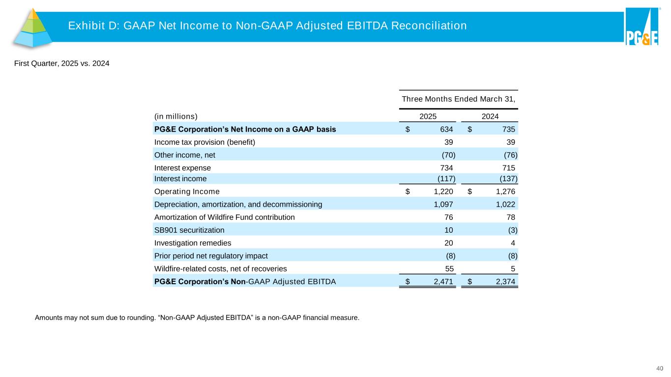 40截至3月31日的三个月,(百万)20252024年太平洋煤气和电力公司按公认会计原则计算的净收入634美元735美元所得税准备金(福利)3939其他收入,净额(70)(76)利息费用734715利息收入(117)(137)营业收入1,220美元1,276美元折旧、摊销和退役1,0971,022摊销野火基金捐款7678 SB901证券化10(3)调查补救措施204前期净监管影响(8)(8)与野火相关的成本,扣除追回款后的净额555丨PG & E Corporation丨非公认会计原则调整后EBITDA 2,471美元2,374美元第一季度,由于四舍五入,2025年与2024年的金额可能不相加。“非美国通用会计准则调整后EBITDA”是一种非美国通用会计准则财务指标。附件 D:GAAP净收入与Non-GAAP调整后EBITDA的对账情况太平洋煤气和电力 Corporation图表D:GAAP净收入与Non-GAAP调整后EBITDA的对账情况