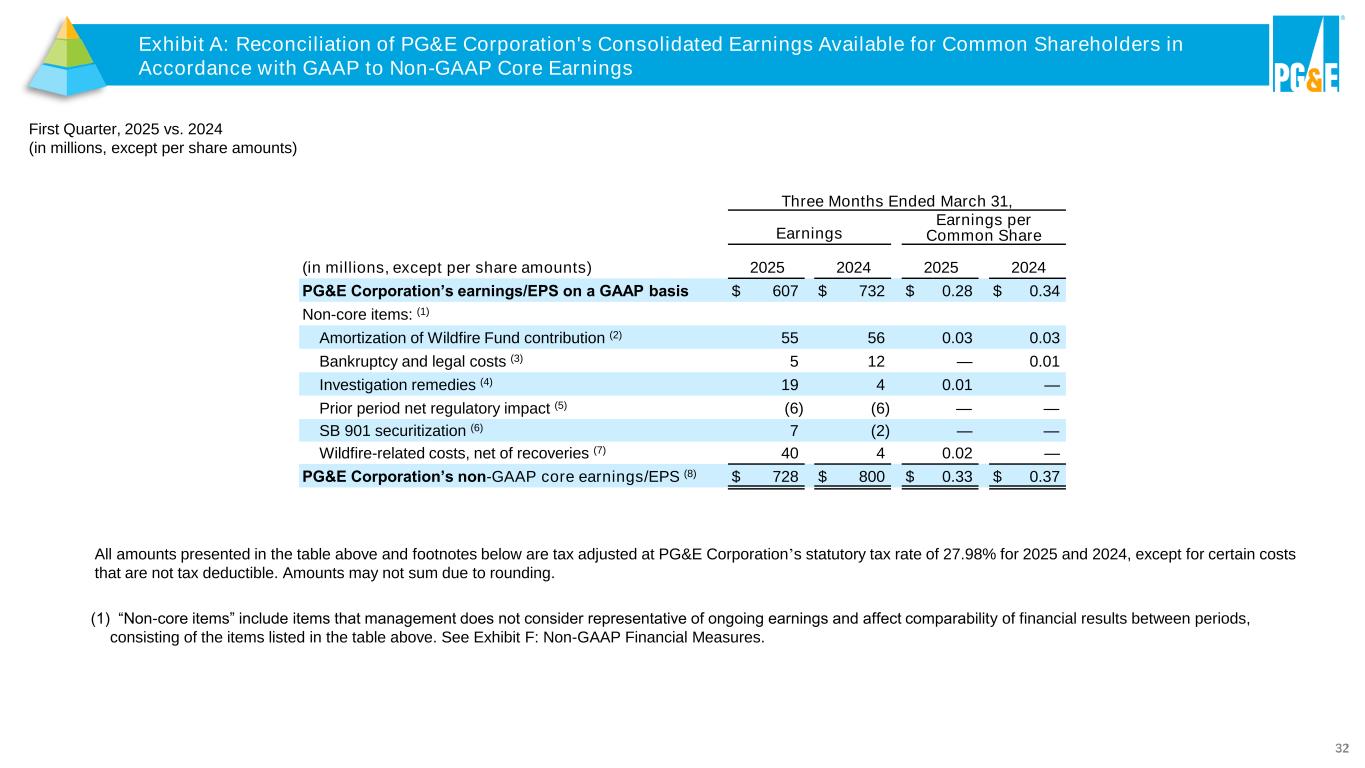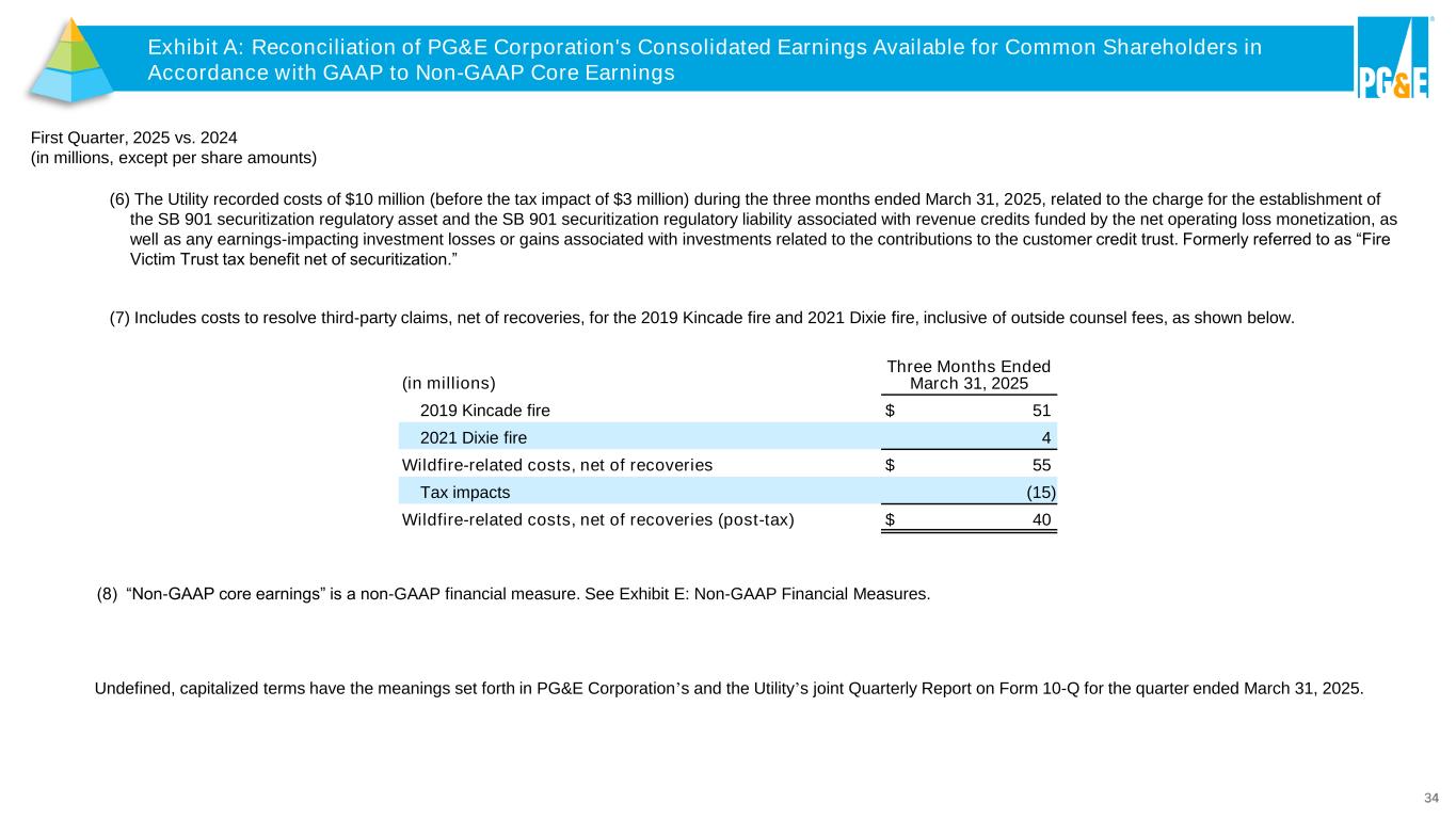 342025年第一季度对比2024年(以百万计,每股金额除外)(8)“Non-GAAP核心收益”是一种非GAAP财务指标。见附件 E:Non-GAAP财务指标。未定义的大写术语具有太平洋煤气和电力公司和公用事业公司截至2025年3月31日的季度10-Q表联合季度报告中规定的含义。(7)包括解决2019年Kincade火灾和2021年Dixie火灾的第三方索赔的费用,扣除追回款,包括外部律师费,如下所示。(单位:百万)截至2025年3月31日的三个月2019年Kincade火灾51美元2021年迪克西火灾4与野火相关的成本,扣除追回的55美元税收影响(15)与野火相关的成本,扣除追回款(税后)40美元附件 A:太平洋煤气和电力公司根据公认会计原则(“GAAP”)可供普通股股东使用的合并收益与非GAAP核心收益的对账太平洋煤气和电力公司:TERM3根据GAAP可供普通股股东使用的合并收益与非GAAP核心收益(6)的对账截至2025年3月31日的三个月内,公用事业部门记录的成本为1000万美元(税前影响为300万美元),涉及设立SB 901证券化监管资产的费用和与净经营亏损货币化提供资金的收入信贷相关的SB 901证券化监管责任,以及与对客户信用信托的贡献相关的投资相关的任何影响收益的投资损失或收益。前身为“证券化的火灾受害者信托税惠网”。