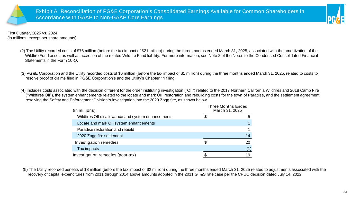 332025年第一季度与2024年对比(以百万计,每股金额除外)(3)在截至2025年3月31日的三个月内,太平洋煤气和电力公司和公用事业公司记录的成本为600万美元(未扣除100万美元的税收影响),与解决在太平洋煤气和电力公司和公用事业公司第11章备案中提交的索赔证明的成本有关。(2)公用事业公司在截至2025年3月31日的三个月内记录了与野火基金资产摊销相关的成本7600万美元(税前影响2100万美元),以及相关的野火基金负债的增加。更多信息,请参见10-Q表格中简明合并财务报表附注的附注2。附件 A:太平洋煤气和电力公司根据公认会计原则(“GAAP”)可供普通股股东使用的合并收益与非GAAP核心收益的对账附件 A:太平洋煤气和电力公司根据GAAP可供普通股股东使用的合并收益与非GAAP核心收益的对账(4)包括与对2017年北加州野火和2018年营火(“野火OII”),与定位和标记OII、天堂小镇的恢复和重建费用以及解决安全和执法部门对2020年佐格火灾的调查的和解协议相关的系统增强功能,如下图所示。(单位:百万)截至2025年3月31日的三个月Wildfires OII不允许和系统增强$ 5定位和标记OII系统增强1天堂恢复和重建12020 Zogg火灾解决方案14调查补救措施20美元税收影响(1)调查补救措施(税后)$ 19(5)公用事业公司在截至2025年3月31日的三个月内记录了800万美元的收益(未扣除200万美元的税收影响),这些收益与根据CPUC日期为2022年7月14日的决定在2011年GT & S费率案例中采用的金额以上的与2011年至2014年资本支出回收相关的调整有关。
