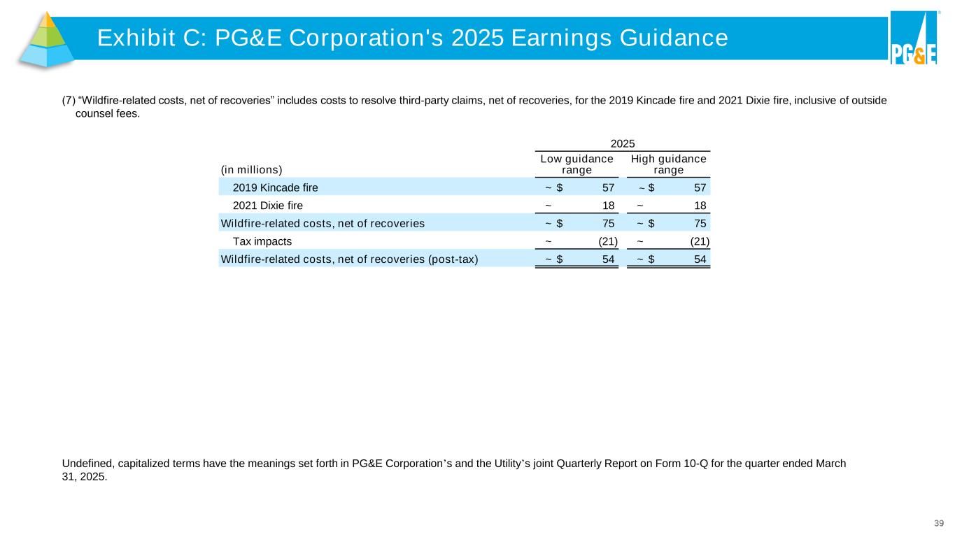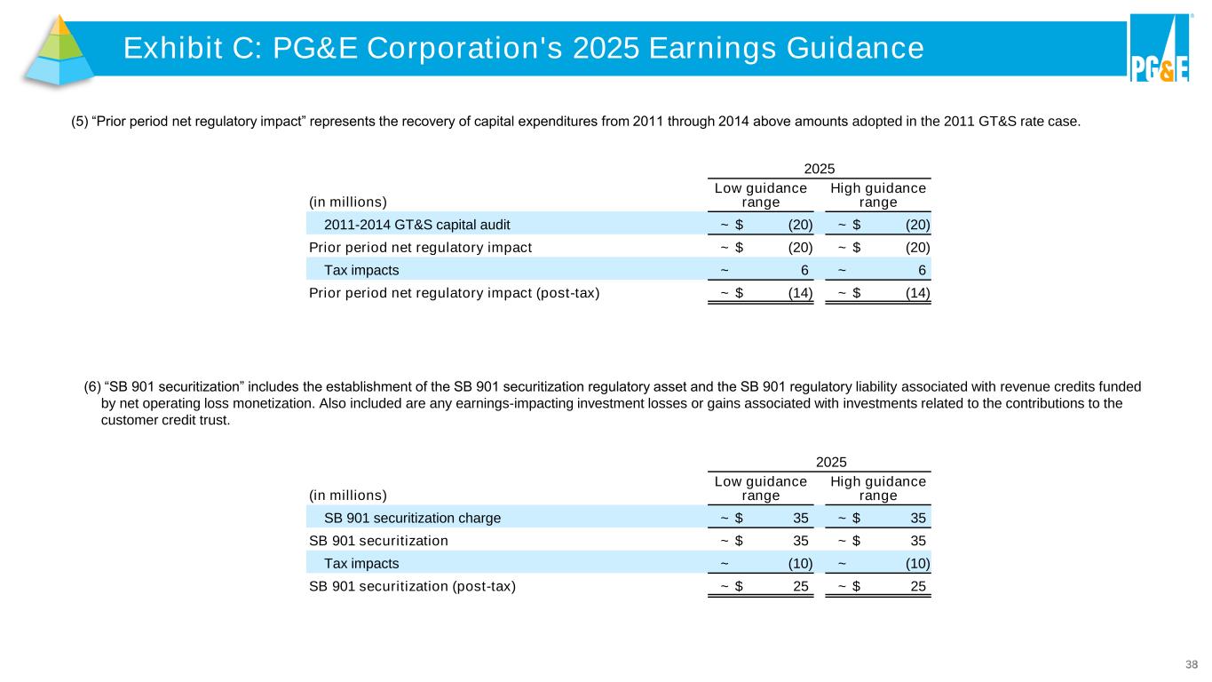 38(5)“前期净监管影响”是指2011年至2014年资本支出的回收,高于2011年GT & S费率案例中采用的金额。2025年(百万)低指导范围高指导范围2011-2014年GT & S资本审计~$(20)~$(20)上一期净监管影响~$(20)~$(20)税收影响~6~6上一期净监管影响(税后)~$(14)~$(14)附件 C:太平洋煤气和电力公司的2024年盈利指引图表C:太平洋煤气和电力 Corporation的205盈利指引(6)“SB 901证券化”包括建立SB 901证券化监管资产以及与由净营业亏损货币化提供资金的收入信贷相关的SB 901监管负债。还包括与对客户信用信托的贡献相关的投资相关的任何影响收益的投资损失或收益。2025年(百万)低指导范围高指导范围SB 901证券化收费~35美元~35美元SB 901证券化~35美元~35美元税收影响~(10)~(10)SB 901证券化(税后)~25美元~25美元