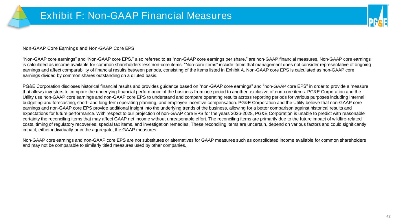 42非美国通用会计准则核心收益和非美国通用会计准则核心每股收益“非美国通用会计准则核心收益”和“非美国通用会计准则核心每股收益”,也称为“非美国通用会计准则核心每股收益”,是非美国通用会计准则财务指标。非美国通用会计准则核心收益计算为普通股股东可获得的收入减去非核心项目。“非核心项目”包括管理层认为不代表持续收益并影响不同期间财务业绩可比性的项目,由附件 A中列出的项目组成。Non-GAAP核心EPS的计算方法为Non-GAAP核心收益除以稀释后的已发行普通股。太平洋煤气和电力公司披露历史财务业绩并根据“非美国通用会计准则核心收益”和“非美国通用会计准则核心每股收益”提供指引,以便提供一种衡量标准,允许投资者比较不同时期业务的基本财务业绩,不包括非核心项目。太平洋煤气和电力公司和公用事业公司使用非美国通用会计准则核心收益和非美国通用会计准则核心每股收益来理解和比较报告期内的经营业绩,用于各种目的,包括内部预算编制和预测、短期和长期经营规划以及员工激励薪酬。太平洋煤气和电力公司和公用事业公司认为,非GAAP核心收益和非GAAP核心每股收益提供了对业务基本趋势的额外洞察,从而可以更好地与历史业绩和对未来业绩的预期进行比较。关于我们对2026-2028年非GAAP核心EPS的预测,太平洋煤气和电力公司无法在不做出不合理努力的情况下以合理的确定性预测可能影响GAAP净收入的调节项目。调节项目主要是由于与野火相关的成本、监管恢复的时间、特殊税收项目和调查补救措施的未来影响。这些调节项目是不确定的,取决于各种因素,可能会单独或总体上对GAAP措施产生重大影响。非GAAP核心收益和非GAAP核心EPS不能替代或替代GAAP衡量标准,例如普通股股东可获得的合并收入,可能无法与其他公司使用的类似名称的衡量标准进行比较。附件 F:Non-GAAP财务指标附件 E:太平洋煤气和电力公司2020年和2021年盈利指引