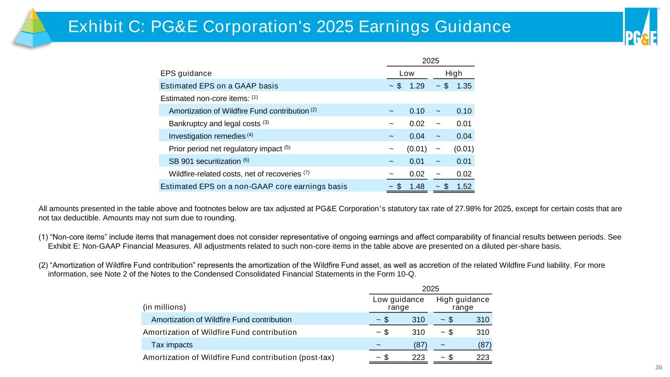 362025年EPS指引低按公认会计原则估计EPS高~1.29美元~1.35美元非核心项目估计:(1)野火基金捐款摊销(2)~0.10~0.10破产和法律费用(3)~0.02~0.01调查补救措施(4)~0.04~0.04前期净监管影响(5)~(0.01)~(0.01)SB 901证券化(6)~0.01~0.01野火相关费用,扣除回收额(7)~0.02~0.02按非公认会计原则核心收益基础计算的估计每股收益~1.48美元~1.52美元上表和下文脚注中列出的所有金额均按2025年太平洋煤气和电力公司的法定税率27.98%进行了税收调整,但某些成本不可扣税。由于四舍五入,金额可能不相加。(1)“非核心项目”包括管理层认为不能代表持续收益并影响各期财务业绩可比性的项目。见附件 E:Non-GAAP财务指标。上表中与此类非核心项目相关的所有调整均按稀释后的每股基础列报。2025年(百万)低指导范围高指导范围野火基金捐款摊销~310美元~310美元野火基金捐款摊销~310美元~310美元税收影响~(87)~(87)野火基金捐款摊销(税后)~223美元~223美元(2)“野火基金捐款摊销”是指野火基金资产的摊销,以及相关的野火基金负债的增加。有关更多信息,请参阅10-Q表格中简明合并财务报表附注的附注2。附件 C:太平洋煤气和电力公司的2024年盈利指引图表C:太平洋煤气和电力 Corporation的205盈利指引