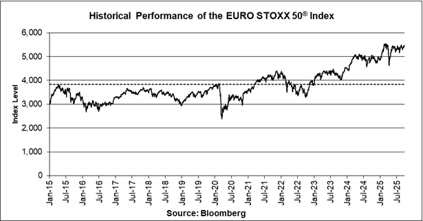 下图展示了欧元斯托克50的每日表现®指数自2015年1月2日至2025年9月24日,基于彭博资讯,未经独立核实。欧元斯托克50的收盘水平®2025年9月24日指数为5464.56。我们获得了欧元斯托克50的收盘水平®指数高于和低于彭博,未经独立核实。