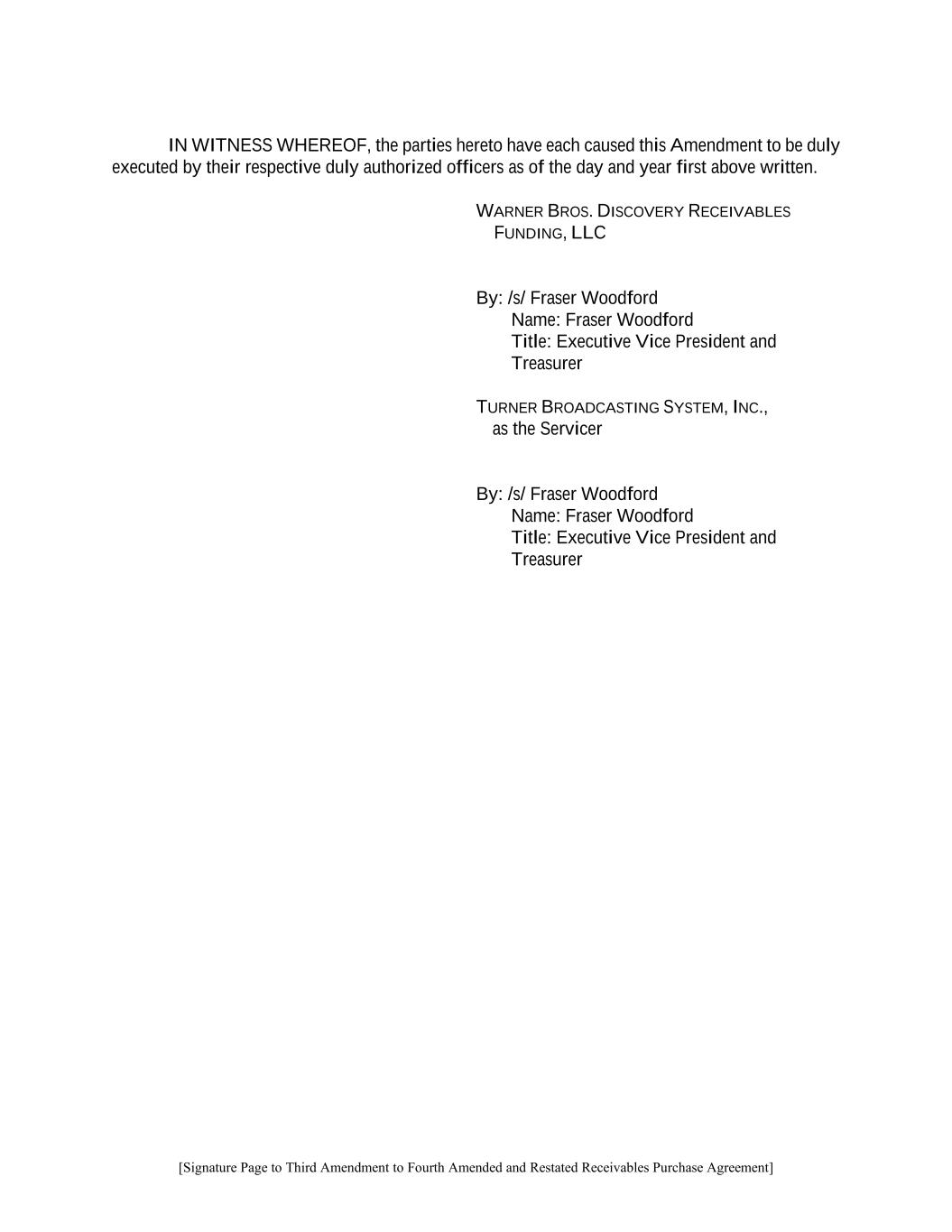 【第四次经修订和重述的应收账款购买协议的第三次修订的签署页】作为证明,本协议各方各自已促使本修订由其各自正式授权的高级人员在上述日期和年份首次书面正式签署。华纳兄弟。Discovery Receivables Funding,LLC by:/s/Fraser Woodford Name:Fraser Woodford Title:Executive Vice President and Treasurer Turner BroadCasting System,INC.,as the Servicer by:/s/Fraser Woodford Name:Fraser Woodford Title:Executive Vice President and Treasurer