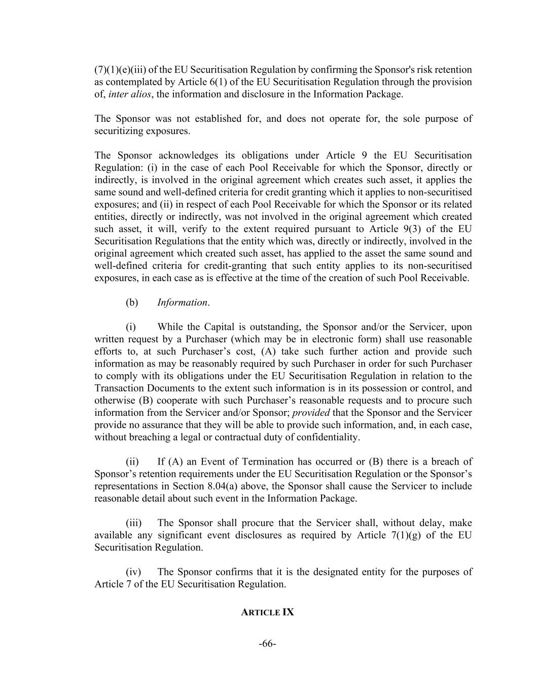 -66-(7)(1)(e)(iii)欧盟证券化条例,通过提供信息包中的信息和披露等方式确认《欧盟证券化条例》第6(1)条所设想的保荐人的风险自留。保荐机构的成立不是为了,也不是为了证券化敞口的唯一目的。保荐人承认其根据欧盟证券化条例第9条承担的义务:(i)对于发起人直接或间接参与创建此类资产的原始协议的每个应收款项池,其适用与其适用于非证券化风险敞口的相同的健全和明确界定的授信标准;以及(ii)对于发起人或其相关实体未直接或间接参与创建此类资产的原始协议的每个应收款项池,其将,在《欧盟证券化条例》第9(3)条要求的范围内核实,直接或间接参与创建此类资产的原始协议的实体,已对该资产适用与该实体对其非证券化风险敞口适用的相同的健全和明确界定的授信标准,在每种情况下,在创建此类集合应收款时有效。(b)信息。(i)在资本未偿还期间,保荐人和/或服务商应买方的书面请求(可能采用电子形式),以该买方的成本,尽合理努力(a)采取该买方可能合理要求的进一步行动并提供该买方可能合理要求的信息,以便该买方在其拥有或控制的范围内遵守其根据欧盟证券化条例就交易文件承担的义务,(b)配合该买方的合理要求,并从服务商和/或保荐人处获得此类信息;前提是,保荐人和服务商不保证他们将能够提供此类信息,并且在每种情况下,不违反法律或合同规定的保密义务。(ii)如果(a)发生了终止事件或(b)违反了《欧盟证券化条例》规定的保荐人保留要求或上述第8.04(a)节中保荐人的陈述,则保荐人应促使服务商在信息包中包含有关该事件的合理细节。(iii)保荐人应促使服务商毫不迟延地按照欧盟证券化条例第7(1)(g)条的要求提供任何重大事件披露。(iv)保荐人确认其为欧盟证券化条例第7条所指的指定实体。第九条