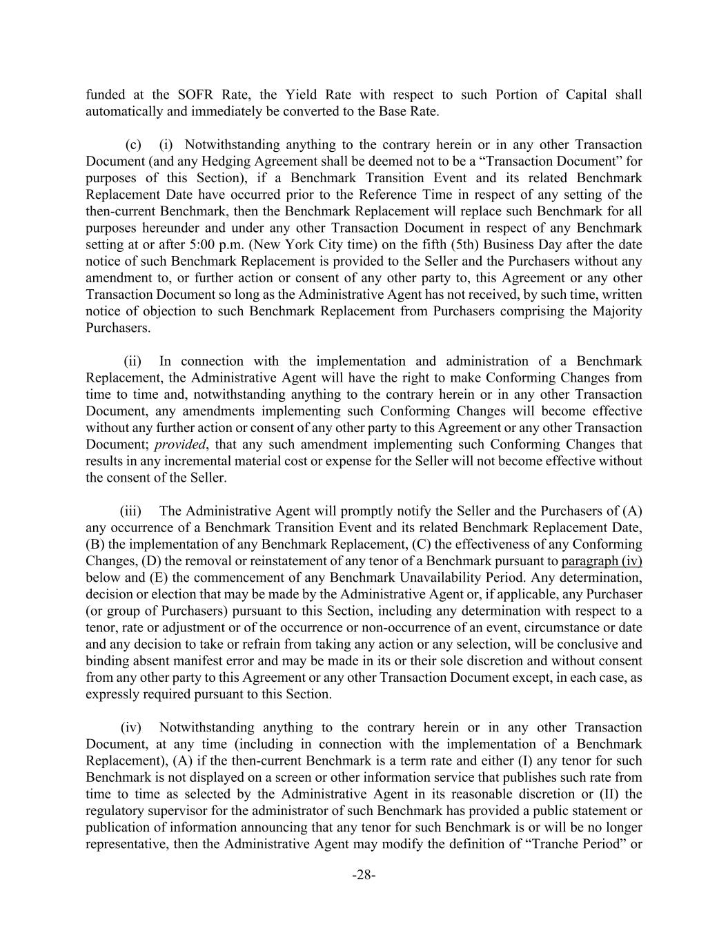 -28-按SOFR利率出资,该部分资本的收益率应自动立即转换为基准利率。(c)(i)尽管本文或任何其他交易文件中有任何相反的规定(而就本条而言,任何套期保值协议应被视为不是“交易文件”),如果就当时的基准的任何设定而言,基准过渡事件及其相关的基准更换日期已在参考时间之前发生,然后,基准更换将在下午5:00或之后向卖方和买方提供此类基准更换通知之日后的第五(5)个工作日(纽约市时间)为本协议项下和任何其他交易文件项下有关任何基准设置的所有目的更换此类基准,而无需对本协议或任何其他交易文件作出任何修改,或任何其他方采取进一步行动或同意,只要该行政代理人在该时间尚未收到,由多数购买者组成的购买者发出的反对此类基准更换的书面通知。(ii)就基准更换的实施和管理而言,行政代理人将有权不时作出一致的变更,尽管本协议或任何其他交易文件中有任何相反的规定,但实施此类一致变更的任何修订将在无需本协议或任何其他交易文件的任何其他方采取任何进一步行动或同意的情况下生效;前提是,实施此类一致的变更导致卖方的任何增量材料成本或费用的任何此类修订将不会在未经卖方同意的情况下生效。(iii)行政代理人将迅速通知卖方和买方(a)任何基准过渡事件的发生及其相关的基准更换日期,(b)任何基准更换的实施,(c)任何一致变更的有效性,(d)根据下文第(iv)段取消或恢复基准的任何期限,以及(e)任何基准不可用期限的开始。行政代理人或(如适用)任何买方(或一组买方)依据本条可能作出的任何裁定、决定或选择,包括有关期限、费率或调整的任何裁定,或有关某一事件、情况或日期的发生或不发生的任何裁定,以及采取或不采取任何行动或任何选择的任何决定,将是决定性和具有约束力的,无明显错误,可由其或其自行酌情作出,且无需获得本协议或任何其他交易文件的任何其他方的同意,但,在每种情况下,根据本节的明确要求。(iv)尽管本文或任何其他交易文件中有任何相反的规定,但在任何时候(包括与实施基准更换有关的),(a)如当时的基准为定期利率,而(i)该基准的任何期限未显示在不时公布行政代理人合理酌情所选定的该利率的屏幕或其他信息服务上,或(ii)该基准的管理人的监管主管已提供公开声明或发布信息,宣布该基准的任何期限不再具有或将不再具有代表性,则行政代理人可修改“分档期”的定义或