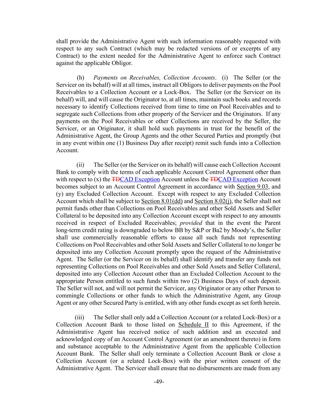-49-应向行政代理人提供就任何此类合同(可能是任何合同的编辑版本或节选)合理要求的此类信息,以供行政代理人对适用的义务人执行此类合同所需。(h)应收款项、收款账户的付款。(i)卖方(或代其提供服务的人)将在任何时候指示所有义务人将集合应收账款的付款交付到收款账户或锁箱。卖方(或代其服务的服务商)将并将促使发起人在任何时候维护必要的账簿和记录,以识别不时收到的集合应收账款,并将此类收款与服务商和发起人的其他财产分开。如果卖方、服务商或发起人收到池应收款或其他收款的任何款项,则应为行政代理人、集团代理人和其他有担保方的利益以信托方式持有该等款项,并迅速(但无论如何在收到后一(1)个工作日内)将该等资金汇入收款账户。(ii)卖方(或代表卖方的服务商)将促使每个收款账户银行遵守每个适用账户控制协议的条款,但(x)TDCAD异常账户除外,除非TDCAD异常账户根据第9.03条成为账户控制协议的约束,以及(y)任何除外收款账户。除任何受第8.01(dd)节和第8.02(j)节约束的除外收款账户外,卖方不得允许将集合应收账款和其他已售资产及卖方抵押品上的收款以外的资金存入任何收款账户,但就除外应收款收到的任何金额除外;前提是,如果母公司的长期信用评级被标普下调至BB以下或被穆迪下调至Ba2,卖方应根据行政代理人的请求,以商业上合理的努力促使所有这些不代表集合应收账款和其他已售资产及卖方抵押品上的收款的资金不再立即存入任何收款账户。卖方(或代其服务的人)应识别并将任何不代表集合应收账款和其他已售资产及卖方抵押品上的收款的资金,存入除除外收款账户以外的任何收款账户,并在该存款的两(2)个营业日内转移给有权获得该资金的适当人员。卖方不会、也不会允许服务商、任何发起人或任何其他人将行政代理人、任何集团代理人或任何其他有担保方有权获得的收款或其他资金与任何其他资金混合,除非本协议规定。(iii)只有在行政代理人已从适用的收款账户银行收到行政代理人可接受的形式和实质的账户控制协议(或其修订)的已签署和确认的副本的情况下,卖方才应在本协议附表II所列的账户上增加收款账户(或相关的锁箱)或收款账户银行。卖方只有在行政代理人事先书面同意的情况下,方可终止某一收款账户银行或关闭某一收款账户(或相关的锁箱)。服务商应确保不会从任何