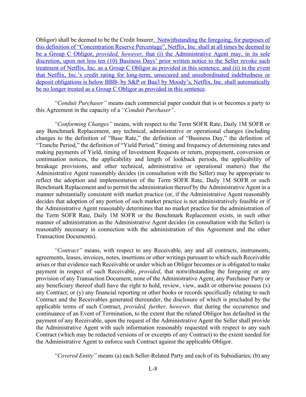 L-8义务人)视为信用保险人。尽管有上述规定,就“集中储备百分比”的这一定义而言,Netflix,Inc.在任何时候都应被视为C组义务人,但前提是:(i)行政代理人可全权酌情在提前不少于十(10)个工作日向卖方发出书面通知后,撤销本句中规定的将Netflix,Inc.视为C组义务人的待遇,以及(ii)如果奈飞公司的长期、无担保和非次级债务或存款义务的信用评级低于BBB-(由标普)或由穆迪、Netflix、Inc.将自动不再被视为本句规定的C组义务人。“管道买方”是指以“管道买方”身份成为或成为本协议一方的每一商业票据管道。“符合性变化”是指,就期限SOFR率、每日1M SOFR或任何基准替换而言,任何技术、行政或运营变化(包括“基准利率”定义、“营业日”定义、“分档期”定义、“收益期”定义的变化,行政代理人(与卖方协商)合理决定的确定费率和支付收益率的时间和频率、投资请求或回报的时间、提前还款、转换或延续通知、回溯期的适用性和长度、破损条款的适用性以及其他技术、行政或操作事项)可能适当,以反映采用和实施定期SOFR费率、每日1M SOFR或此类基准替换,并允许行政代理人以基本符合市场惯例的方式进行管理(或,如果行政代理人合理地决定采用该等市场惯例的任何部分在行政上不可行,或者如果行政代理人合理地确定不存在管理定期SOFR利率、每日1M SOFR或基准替换的市场惯例,则以行政代理人决定的其他管理方式(与卖方协商)在管理本协议和其他交易文件方面合理必要)。“合同”是指,就任何应收款而言,产生此类应收款所依据的任何和所有合同、文书、协议、租赁、发票、票据、插页或其他文字,或此类应收款或债务人成为或有义务就此类应收款进行付款的证据,但条件是,尽管有上述规定或任何交易文件的任何规定,行政代理人、任何买方或其任何受益人均无权持有、审查、查看,审计或以其他方式拥有(x)任何合同;或(y)任何财务报告或其他账簿或记录,具体涉及该合同以及根据该合同产生的应收款项,但该合同的适用条款不允许披露,但条件是,在终止事件发生和持续期间,只要相关债务人拖欠任何应收款项,应行政代理人的请求,卖方应向行政代理人提供就任何此类合同(可能是任何合同的编辑版本或节选)合理要求的信息,以供行政代理人对适用的义务人执行此类合同所需。“涵盖实体”是指(a)每个卖方关联方及其子公司;(b)任何
