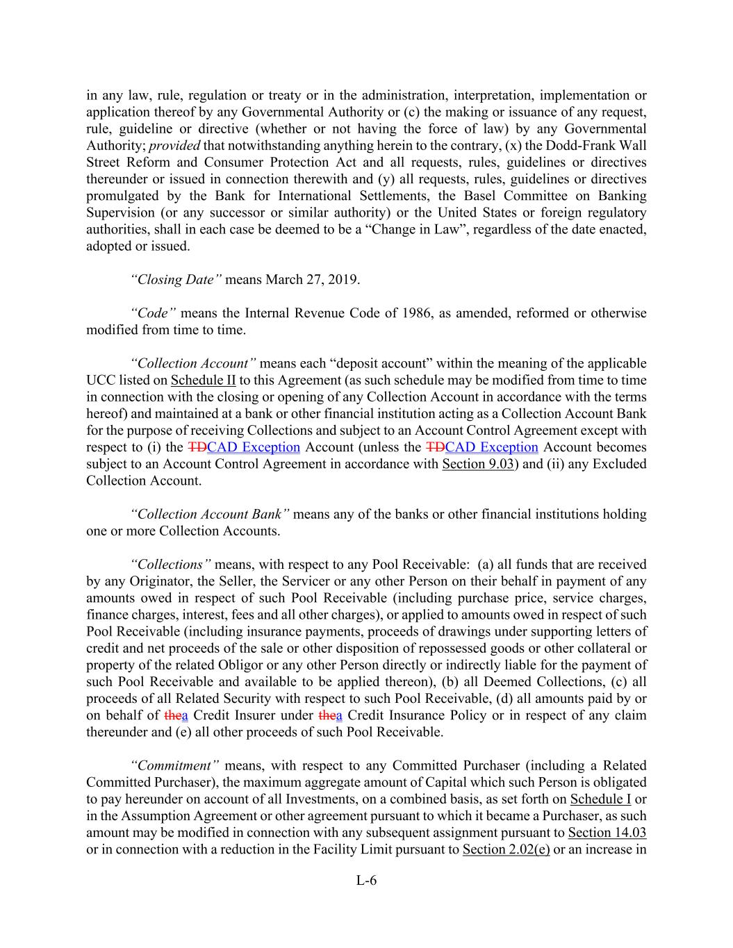 L-6在任何法律、规则、条例或条约中,或在任何政府当局的管理、解释、实施或适用中,或(c)任何政府当局提出或发布任何请求、规则、准则或指令(无论是否具有法律效力);但条件是,尽管有任何相反的规定,(x)《多德-弗兰克华尔街改革和消费者保护法》及其下或与之相关发布的所有请求、规则、准则或指令,以及(y)国际清算银行颁布的所有请求、规则、准则或指令,巴塞尔银行监管委员会(或任何继任或类似机构)或美国或外国监管机构,在每种情况下均应被视为“法律变更”,无论颁布、通过或发布的日期如何。“截止日期”是指2019年3月27日。“法典”是指经不时修订、改革或以其他方式修改的1986年《国内税收法典》。“收款账户”指本协议附表II所列适用的UCC所指的每个“存款账户”(该附表可能会因任何收款账户根据本协议的条款的关闭或开立而不时修改),并在为接收收款而担任收款账户银行的银行或其他金融机构维持及受账户管制协议规限,但(i)TDAD例外账户(除非TDAD例外账户根据第9.03条成为账户管制协议规限)及(ii)任何不包括在内的收款账户除外。“收款账户银行”是指持有一个或多个收款账户的任何银行或其他金融机构。“收款”是指,就任何集合应收款而言:(a)任何发起人、卖方、服务商或代表他们的任何其他人为支付就该集合应收款所欠的任何金额(包括购买价格、服务费、财务费用、利息、费用和所有其他费用)而收到的所有资金,或适用于就该集合应收款所欠的金额(包括保险金,支持信用证项下的提款收益,以及相关义务人或直接或间接对该应收款项池的付款负有责任且可用于支付的任何其他人的抵债货物或其他抵押品或财产的出售或以其他方式处置的净收益),(b)所有视为收款,(c)与该应收款项池有关的所有相关担保的所有收益,(d)信用保险公司根据信用保险单或就根据该保险单提出的任何索赔而支付或代表该信用保险公司支付的所有款项,以及(e)该应收款项池的所有其他收益。“承诺”是指,就任何承诺买方(包括相关承诺买方)而言,根据附表I或假设协议或其成为买方所依据的其他协议中规定的合并基础上的所有投资,该人根据本协议有义务支付的最高资本总额,因为该金额可能会因根据第14.03条进行的任何后续转让而修改,或因根据第2.02(e)条减少融资额度或增加