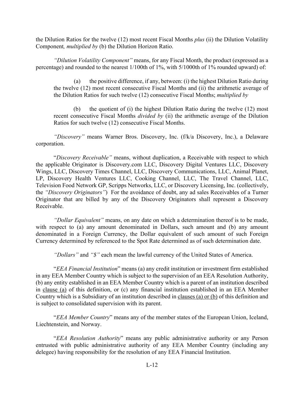 L-12十二(12)个最近财政月份的稀释比率加上(ii)稀释波动率成分,乘以(b)稀释地平线比率。“稀释波动成分”是指,对于任何一个财政月,产品(以百分比表示)并四舍五入到最接近的1%的1/100,其中1%的5/1000向上四舍五入)为:(a)正差,如果有的话,介于:(i)十二(12)个最近连续会计月期间的最高稀释比率及(ii)该十二(12)个连续会计月期间的稀释比率的算术平均值;乘以(b)(i)十二(12)个最近连续会计月期间的最高稀释比率除以(ii)该十二(12)个连续会计月期间的稀释比率的算术平均值的商。“发现”是指Warner Bros. Discovery, Inc.(f/k/a Discovery,Inc.),一家特拉华州公司。“Discovery Receivable”是指,在不重复的情况下,适用的发起人为Discovery.com LLC、Discovery Digital Ventures LLC、Discovery Wings,LLC、Discovery Times Channel,LLC、Discovery Communications,LLC、Animal Planet,LP、Discovery Health Ventures LLC、Cooking Channel,LLC、The Travel Channel,LLC、Television Food Network GP、Scripps Networks,LLC或Discovery Licensing,Inc.(统称“Discovery发起人”)的应收款项,由任何Discovery发起人开具账单的Turner发起人的任何广告销售应收款应代表Discovery应收款。“等值美元”是指,在作出确定的任何日期,就(a)以美元计价的任何金额、该金额和(b)以外币计价的任何金额而言,参照在该确定日期确定的即期汇率确定的该等外币金额的等值美元。“美元”和“美元”各指美利坚合众国的法定货币。“EEA金融机构”是指(a)在任何EEA成员国设立的受EEA决议当局监管的任何信贷机构或投资公司,(b)在EEA成员国设立的任何实体,该实体是本定义(a)条所述机构的母公司,或(c)在EEA成员国设立的任何金融机构,该金融机构是本定义(a)或(b)条所述机构的子公司,并与其母公司合并监管。“EEA成员国”是指欧盟的任何成员国,冰岛、列支敦士登、挪威。“EEA决议当局”是指负责任何EEA金融机构的决议的任何公共行政当局或任何受托管理任何EEA成员国公共行政当局的人(包括任何受权人)。