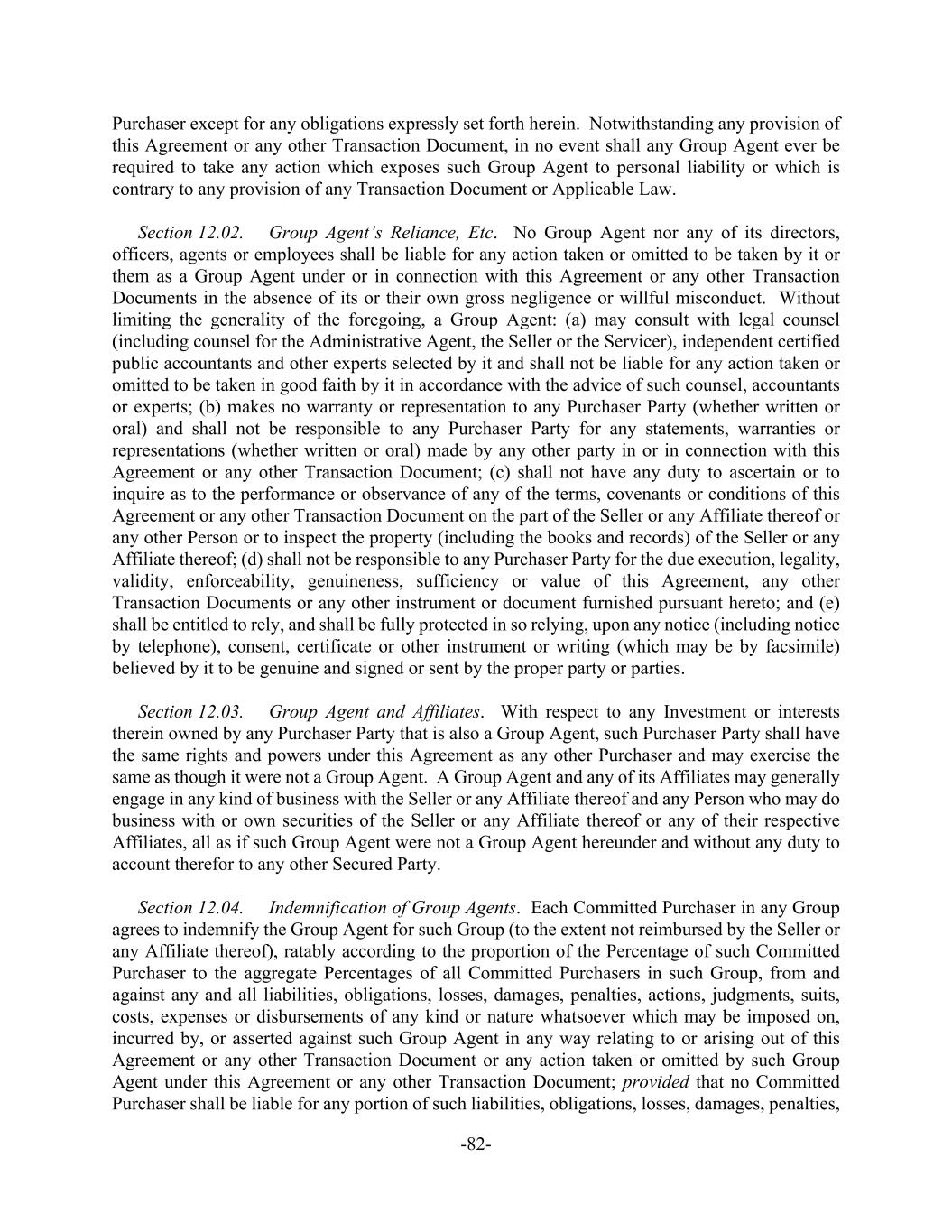 -82-买方,但此处明确规定的任何义务除外。尽管有本协议或任何其他交易文件的任何规定,在任何情况下均不得要求任何集团代理人采取任何使该集团代理人承担个人责任或违反任何交易文件或适用法律的任何规定的行动。第12.02节。Group Agent的Reliance,etc。任何集团代理人或其任何董事、高级职员、代理人或雇员,在其本人没有重大过失或故意不当行为的情况下,不得对其或其作为集团代理人根据本协议或任何其他交易文件或与本协议或任何其他交易文件有关而采取或不采取的任何行动承担责任。在不限制前述一般性的情况下,集团代理人:(a)可咨询法律顾问(包括行政代理人、卖方或服务人的法律顾问)、独立注册会计师和其选定的其他专家,不对其根据该等法律顾问、会计师或专家的建议善意采取或不采取的任何行动承担责任;(b)不向任何买方方(无论是书面或口头)作出任何保证或陈述,也不对任何买方方的任何陈述负责,任何其他方就本协议或任何其他交易文件或与之有关而作出的保证或陈述(不论是书面或口头的);(c)没有任何责任确定或查询任何条款的履行或遵守情况,卖方或其任何关联公司或任何其他人的本协议或任何其他交易文件的契诺或条件或检查卖方或其任何关联公司的财产(包括账簿和记录);(d)不得就本协议、任何其他交易文件或根据本协议提供的任何其他文书或文件的适当执行、合法性、有效性、可执行性、真实性、充分性或价值向任何买方方负责;(e)有权依赖,并应在如此依赖时得到充分保护,根据任何通知(包括电话通知)、同意书、证明书或其认为是真实的并由适当的一方或多方签署或发送的其他文书或书面(可采用传真方式)。第12.03节。集团代理和附属公司。就同时为集团代理的任何买方方所拥有的任何投资或其中的权益而言,该买方方应与任何其他买方在本协议下享有相同的权利和权力,并可行使相同的权利和权力,如同其不是集团代理一样。集团代理人及其任何关联公司一般可与卖方或其任何关联公司以及任何可能与卖方或其任何关联公司或其任何关联公司的证券开展业务或拥有其证券的人从事任何种类的业务,所有这些都如同该集团代理人不是本协议项下的集团代理人一样,并且没有任何责任向任何其他有担保方说明。第12.04节。团体代理人的赔偿。任何集团中的每一位承诺买方同意根据该承诺买方占该集团中所有承诺买方的合计百分比的比例,就该集团的该集团代理人(在卖方或其任何关联公司未偿还的范围内)向该集团代理人作出赔偿,以抵偿任何和所有可能被施加、招致的任何责任、义务、损失、损害赔偿、处罚、诉讼、判决、诉讼、费用、费用或任何种类或性质的支出,或以任何与本协议或任何其他交易文件有关或因本协议或任何其他交易文件或该集团代理根据本协议或任何其他交易文件采取或遗漏的任何行动而针对该集团代理提出的主张;但任何承诺的买方不得对该等责任、义务、损失、损害赔偿、罚款的任何部分承担责任,