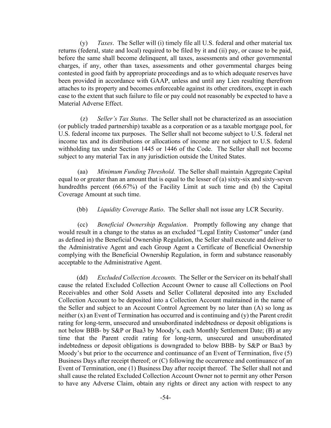-54-(y)税收。卖方将(i)及时提交其要求提交的所有美国联邦和其他重要纳税申报表(联邦、州和地方),并(ii)在其拖欠之前支付或促使支付所有税款、评估和其他政府费用(如果有的话),但通过适当的程序善意地对税款、评估和其他政府费用提出异议且已根据公认会计原则提供足够准备金的税款、评估和其他政府费用除外,除非并直到由此产生的任何留置权附在其财产上并对其其他债权人变得可强制执行,除非在每种情况下,不能合理地预期这种未提交或未付款会产生重大不利影响。(z)卖方的税务状况。就美国联邦所得税而言,卖方不应被定性为协会(或公开交易的合伙企业),应作为公司或应税抵押贷款池征税。卖方不应被征收美国联邦净所得税,其分配或分配的收入根据《守则》第1445或1446条不需缴纳美国联邦预扣税。卖方不应在美国以外的任何司法管辖区缴纳任何物质税。(aa)最低筹资门槛。卖方应保持总资本等于或大于等于(a)当时融资限额的百分之六十六和百分之六十七(66.67%)和(b)当时的资本覆盖金额中较小者的金额。(BB)流动性覆盖率。卖方不得发行任何LCR证券。(CC)实益所有权规制。一旦发生可能导致根据《受益所有权条例》(并如《条例》所定义)被排除在外的“法人实体客户”身份发生变化的任何变化,卖方应立即签署并向行政代理人和每个集团代理人交付符合《受益所有权条例》的、形式和内容均为行政代理人合理接受的受益所有权证书。(dd)不包括的收款账户。卖方或代其服务的服务商应促使相关的排除收款账户所有者促使存入任何排除收款账户的池应收款和其他已售资产及卖方抵押品的所有收款不迟于(a)存入以卖方名义维持并受账户控制协议约束的收款账户,只要(x)终止事件未发生且仍在继续,以及(y)母公司的长期信用评级,无担保和非次级债务或存款义务不低于每个月结算日由标普评定的BBB-或由穆迪评定的Baa3;(b)在任何时候由穆迪评定长期、无担保和非次级债务或存款义务的母公司信用评级由标普或Baa3下调至BBB-以下但在终止事件发生和持续之前,在收到该事件后五(5)个工作日;或(c)在终止事件发生和持续之后,在收到该事件后一(1)个工作日。卖方不应也不应促使相关的排除收款账户所有者不允许任何其他人就任何