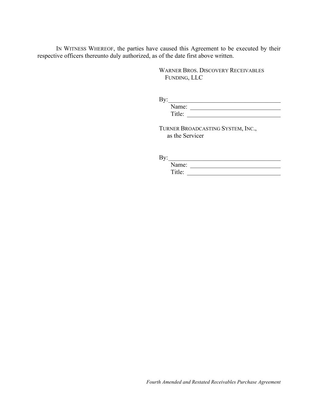 第四次经修订和重述的应收账款购买协议作为证明,双方已安排本协议由各自的高级管理人员正式授权签署,截至上述第一个书面日期。华纳兄弟。Discovery Receivables Funding,LLC by:__________________________________ Name:__________________________________ Title:__________________________________ Turner Broadcasting System,INC.,as the Servicer by:______________________________________________ Name:__________________