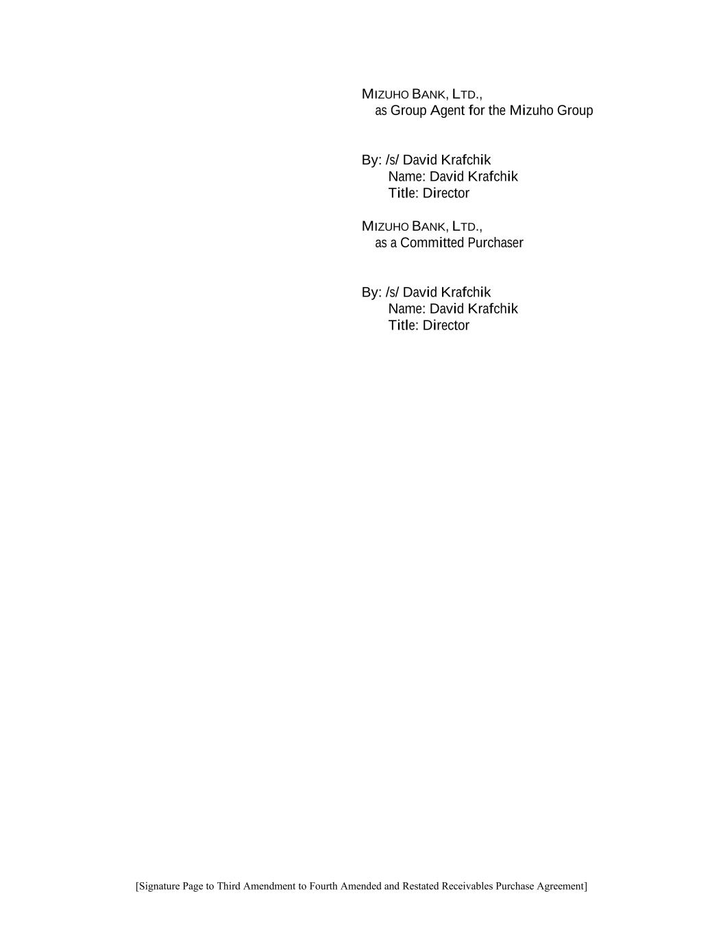 【第四次修订和重述的应收账款购买协议第三次修订的签署页】MIZUHO BANK,LTD.,作为瑞穗集团的集团代理由:/s/David Krafchik Name:David Krafchik Title:Director MIZUHO BANK,LTD.,as a Committed Purchaser by:/s/David Krafchik Name:David Krafchik Title:Director