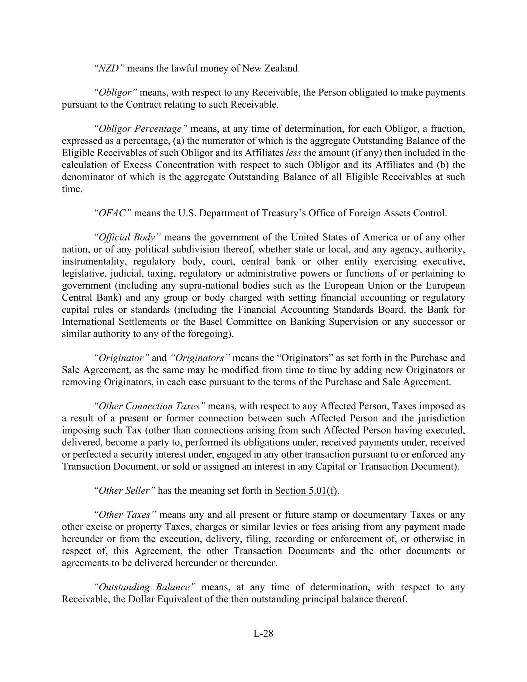 L-28“NZD”是指新西兰的合法货币。“义务人”是指,就任何应收账款而言,根据与此类应收账款有关的合同,有义务支付款项的人。“债务人百分比”是指,在确定的任何时候,对每个债务人而言,一个零头,以百分比表示,(a)其分子是该债务人及其关联公司的合格应收款项的未偿余额总额减去该债务人及其关联公司的超额集中计算中包括的金额(如有),以及(b)其分母是当时所有合格应收款项的未偿余额总额。“OFAC”是指美国财政部的外国资产管制办公室。“官方机构”是指美利坚合众国或任何其他国家的政府,或其任何政治分支机构的政府,无论是州或地方,以及行使政府(包括欧盟或欧洲中央银行等任何超国家机构)的行政、立法、司法、税收、监管或行政权力或职能或与之相关的任何机构、当局、工具、监管机构、法院、中央银行或其他实体,以及负责制定财务会计或监管资本规则或标准的任何团体或机构(包括财务会计准则委员会,国际清算银行或巴塞尔银行监管委员会或任何继承机构或与上述任何机构类似的机构)。“发起人”及“发起人”指买卖协议所载的“发起人”,因为相同的内容可能会不时通过增加新的发起人或移除发起人进行修改,在每种情况下均根据买卖协议的条款进行。“其他关联税”是指,就任何受影响的人而言,由于该受影响的人与征收此类税款的司法管辖区之间存在当前或以前的关联而被征收的税款(不包括因该受影响的人已执行、交付、成为一方当事人、履行其在该项下的义务、收到该项下的付款、收到或完善该项下的担保权益、根据或强制执行任何交易文件从事任何其他交易、或出售或转让任何资本或交易文件的权益而产生的关联)。“其他卖方”具有第5.01(f)节规定的含义。“其他税项”是指因根据本协议支付的任何款项或因执行、交付、备案、记录或强制执行本协议、其他交易文件以及根据本协议或根据本协议将交付的其他文件或协议而产生的任何和所有当前或未来的印花税或跟单税款或任何其他消费税或财产税、收费或类似的征费或费用。“未偿余额”是指,在任何确定时间,就任何应收账款而言,其当时未偿本金余额的等值美元。