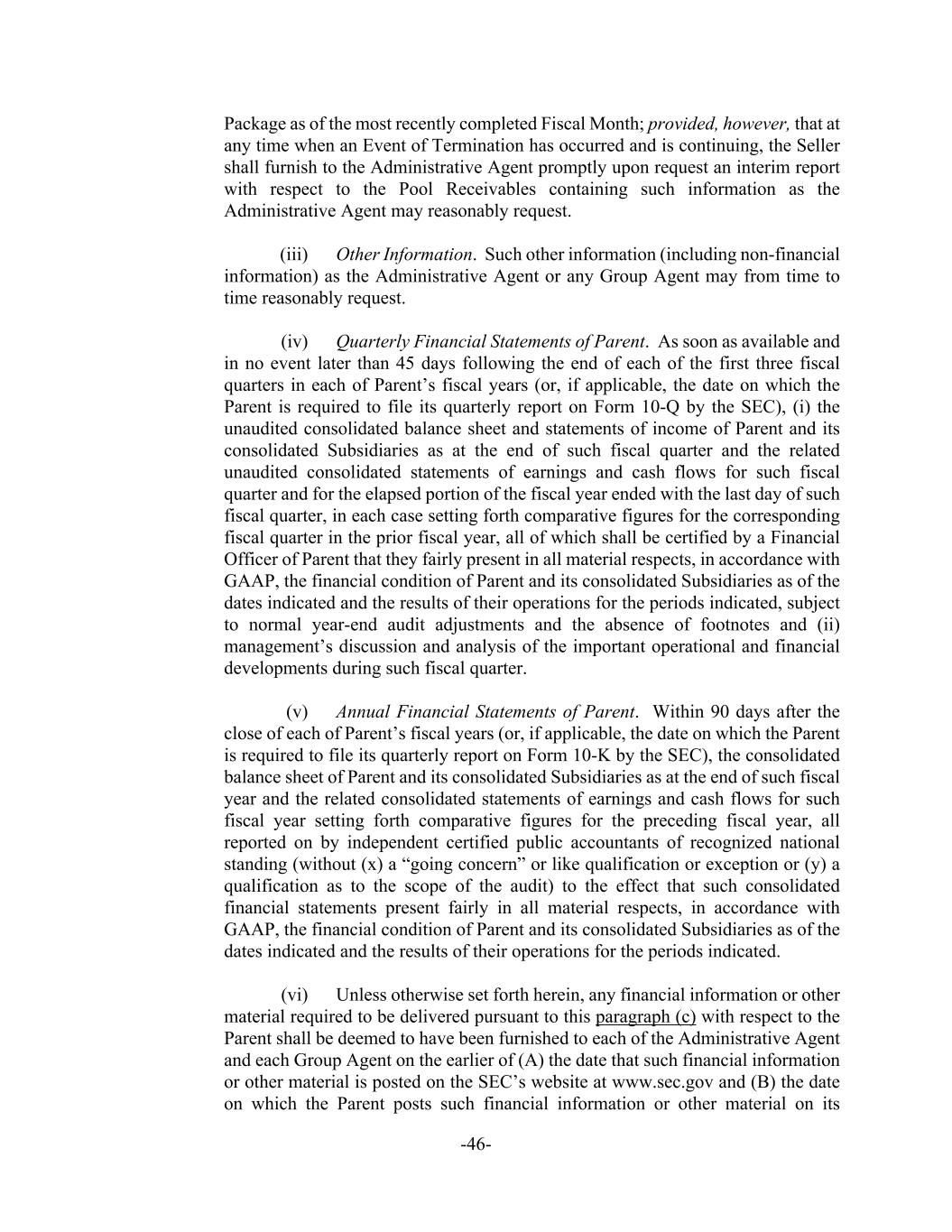 -46-截至最近完成的财政月份的一揽子数据;但条件是,在终止事件已经发生并仍在继续的任何时候,卖方应在提出要求后立即向行政代理人提供关于集合应收款的临时报告,其中应载有行政代理人可能合理要求的信息。(三)其他信息。行政代理人或任何集团代理人可能不时合理要求的其他信息(包括非财务信息)。(四)母公司季度财务报表。尽快提供,且在任何情况下不迟于母公司每个财政年度的前三个财政季度结束后的45天(或,如适用,美国证券交易委员会要求母公司以表格10-Q提交季度报告的日期),(i)母公司及其合并子公司截至该财政季度末的未经审计的综合资产负债表和收益表,以及该财政季度和截至该财政季度最后一天的财政年度已过去部分的相关未经审计的综合收益和现金流量表,在每种情况下均应列出上一财政年度相应财政季度的比较数字,所有这些数字均应由母公司的财务官证明,它们按照公认会计原则在所有重大方面均公允列报,母公司及其合并子公司截至所示日期的财务状况及其所示期间的经营业绩,但须遵守正常的年终审计调整和没有脚注以及(ii)管理层对该财政季度的重要经营和财务发展的讨论和分析。(五)母公司年度财务报表。在母公司每个会计年度结束后的90天内(如适用,或在SEC要求母公司以10-K表格提交季度报告之日),母公司及其合并子公司在该会计年度结束时的合并资产负债表和该会计年度的相关合并收益和现金流量表列出上一会计年度的比较数字,全部由具有公认国家地位的独立注册会计师报告(没有(x)“持续经营”或类似资格或例外或(y)审计范围的资格),大意是此类合并财务报表根据公认会计原则在所有重大方面公允地反映了母公司及其合并子公司截至所示日期的财务状况及其所示期间的经营业绩。(vi)除非本文另有规定,根据本款(c)要求交付的与母公司有关的任何财务信息或其他材料应被视为已在(a)此类财务信息或其他材料在SEC网站www.sec.gov上发布之日和(b)母公司在其上发布此类财务信息或其他材料之日(以较早者为准)提供给每个行政代理人和每个集团代理人