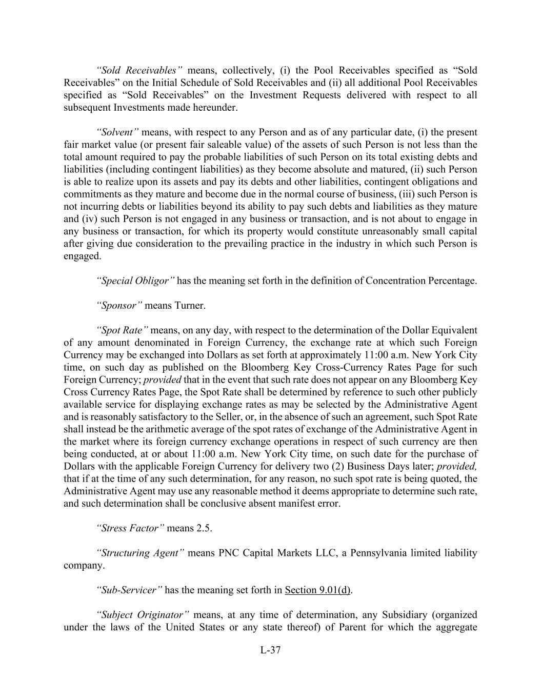L-37“已售应收账款”统称为(i)在已售应收账款的初始附表中指定为“已售应收账款”的集合应收账款和(ii)就根据本协议进行的所有后续投资交付的投资请求中指定为“已售应收账款”的所有额外集合应收账款。“偿付能力”是指,就任何人而言,截至任何特定日期,(i)该人的资产的现时公允市场价值(或现时公允可售货价值)不低于支付该人在其全部现有债务和负债(包括或有负债)上的可能负债所需的总金额,因为这些债务和负债(包括或有负债)成为绝对和到期,(ii)该人能够在其资产上变现,并在正常业务过程中支付其到期和到期的债务和其他负债、或有义务和承诺,(iii)该人并无产生超出其支付到期债务及法律责任能力的债务或法律责任,及(iv)该人并无从事任何业务或交易,亦无即将从事任何业务或交易,而其财产在适当考虑该人所从事的行业的普遍做法后将构成不合理的小额资本。“特别义务人”具有集中百分比定义中规定的含义。“赞助商”是指特纳。“即期汇率”是指,在任何一天,就以外币计价的任何金额的美元等值的确定而言,在彭博关键交叉货币汇率页面上公布的纽约市时间上午11:00左右,该外币可以兑换成美元的汇率;前提是,如果该汇率未出现在任何彭博关键交叉货币汇率页面上,即期汇率应参照行政代理人可能选择的、卖方合理满意的其他可公开获得的显示汇率服务确定,或者,在没有此种协议的情况下,该即期汇率应改为行政代理人在其当时就该货币进行外汇兑换业务的市场上,在纽约市时间上午11:00左右的即期汇率的算术平均值,在该日期以两(2)个工作日后的适用外币购买美元进行交割;条件是,如果在任何此类确定时,由于任何原因,没有对该即期汇率进行报价,则行政代理人可以使用其认为适当的任何合理方法来确定该汇率,并且该确定应是没有明显错误的结论性确定。“压力因子”的意思是2.5。“Structuring Agent”是指PNC Capital Markets LLC,一家宾夕法尼亚州的有限责任公司。“次级服务商”具有第9.01(d)节规定的含义。“主体发起人”是指,在任何确定时间,母公司的任何子公司(根据美国或其任何州的法律组织),其合计