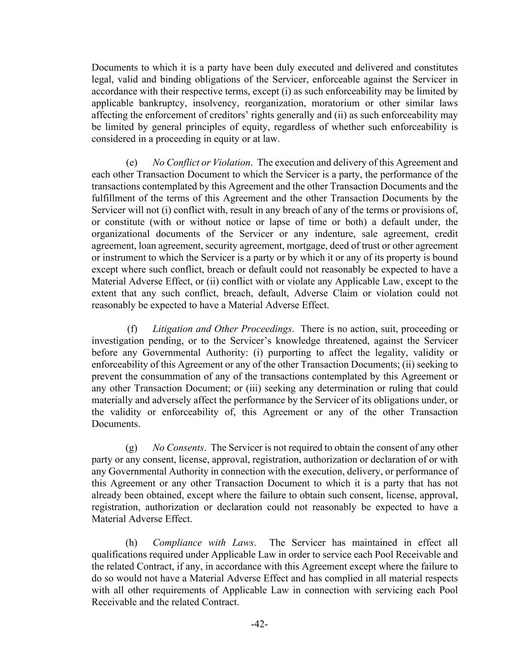 -42-它作为一方当事人的文件已被正式签署和交付,并构成服务人的法律、有效和具有约束力的义务,可根据其各自的条款对服务人强制执行,但(i)此类可执行性可能受到适用的破产、无力偿债、重组、暂停执行或其他影响债权人权利普遍强制执行的类似法律的限制,以及(ii)由于此类可执行性可能受到一般衡平法原则的限制,无论在衡平法程序中还是在法律上考虑此类可执行性。(e)没有冲突或违反行为。本协议和服务商作为一方当事人的彼此交易文件的执行和交付、本协议和其他交易文件所设想的交易的履行以及服务商履行本协议和其他交易文件的条款将不会(i)与服务商的组织文件或任何契约、销售协议、信贷协议、贷款协议相冲突、导致任何违反其任何条款或规定,或构成(无论是否通知或时间流逝或两者兼而有之)违约,除非无法合理预期此类冲突、违约或违约会产生重大不利影响,或(ii)与任何适用法律发生冲突或违反任何适用法律,除非无法合理预期任何此类冲突、违约、违约、不利索赔或违约会产生重大不利影响,否则服务商作为一方当事人或其任何财产受其约束的担保协议、抵押、信托契据或其他协议或文书。(f)诉讼和其他程序。在任何政府当局面前,不存在针对服务商的未决诉讼、诉讼、程序或调查,或据服务商所知威胁:(i)意图影响本协议或任何其他交易文件的合法性、有效性或可执行性;(ii)试图阻止本协议或任何其他交易文件所设想的任何交易的完成;或(iii)寻求可能对服务商履行其在本协议或任何其他交易文件下的义务或其有效性或可执行性产生重大不利影响的任何确定或裁决。(g)没有同意。服务商无需就本协议或其作为一方尚未获得的任何其他交易文件的执行、交付或履行获得任何其他方的同意或任何政府当局的任何同意、许可、批准、登记、授权或声明,除非无法合理地预期未能获得此类同意、许可、批准、登记、授权或声明会产生重大不利影响。(h)遵守法律。服务商一直有效地保持适用法律要求的所有资格,以便根据本协议为每一池应收款项和相关合同(如有)提供服务,除非未能这样做不会产生重大不利影响,并且在所有重大方面遵守了适用法律与为每一池应收款项和相关合同提供服务有关的所有其他要求。