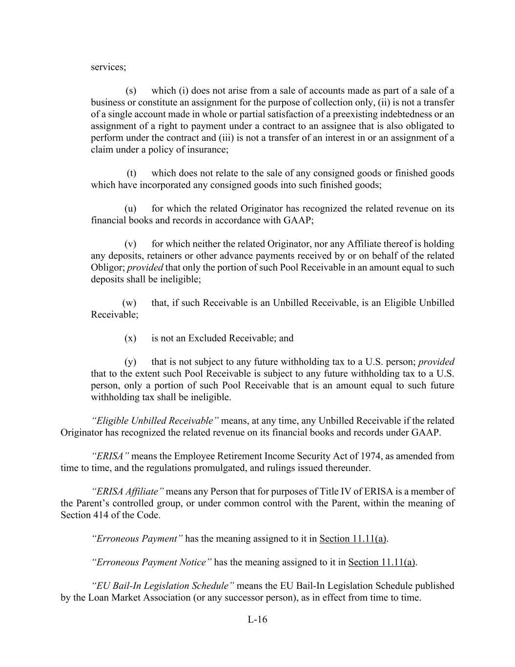 L-16服务;(i)并非产生于作为业务出售的一部分而作出的账户出售或仅构成仅为收款目的的转让的(s)项,(ii)并非为全部或部分清偿先前存在的债务而作出的单一账户的转让,亦非将合同项下的受付权转让予受让人这也是根据合同有义务履行的,并且(iii)不是根据保险单转让权益或转让索赔;(t)与将任何托运货物并入该等制成品的任何托运货物或制成品的销售无关;(u)相关发起人已根据公认会计原则在其财务账簿和记录中确认相关收入;(v)相关发起人及其任何关联公司均未持有任何存款,由相关义务人或代表相关义务人收到的保留金或其他预付款;条件是,只有金额等于该等存款的该等应收款项池部分不符合资格;(w)如果该等应收款项为未开票应收款项,则为符合资格的未开票应收款项;(x)不是排除应收款项;(y)无需向美国人缴纳任何未来预扣税;但在该等应收款项池须向美国人缴纳任何未来预扣税的范围内,只有相当于未来预扣税的这类应收款项池的一部分才不符合资格。“合格未开票应收账款”是指,在任何时候,如果相关发起人已根据公认会计原则在其财务账簿和记录中确认了相关收入,则任何未开票的应收账款。“ERISA”是指经不时修订的1974年《雇员退休收入保障法》及其颁布的法规和根据该法规发布的裁决。“ERISA关联公司”是指根据《守则》第414条的含义,就ERISA标题IV而言是母公司受控集团的成员,或与母公司处于共同控制之下的任何人。“错误付款”具有第11.11(a)节赋予的含义。“错误付款通知”具有第11.11(a)节赋予的含义。“欧盟纾困立法时间表”是指贷款市场协会(或任何继任者)公布的欧盟纾困立法时间表,不时生效。
