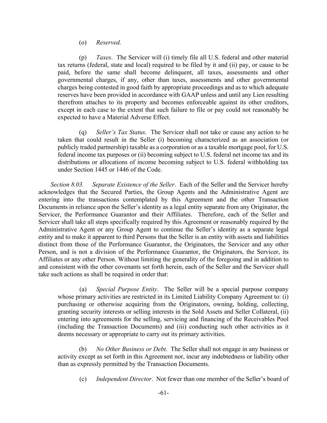 -61-(o)保留。(p)税收。服务商将(i)及时提交其要求提交的所有美国联邦和其他重要纳税申报表(联邦、州和地方),并(ii)在其拖欠之前支付或促使支付所有税款、评估和其他政府费用(如果有的话),但通过适当的程序善意地对税款、评估和其他政府费用提出异议且已根据公认会计原则提供足够准备金的税款、评估和其他政府费用除外,除非并直到由此产生的任何留置权附在其财产上并对其其他债权人变得可强制执行,除非在每种情况下,不能合理地预期这种未提交或未付款会产生重大不利影响。(q)卖方的税务状况。服务商不得采取或促使采取任何可能导致卖方(i)被定性为协会(或公开交易的合伙企业),应作为公司或应税抵押贷款池征税,出于美国联邦所得税目的,或(ii)成为美国联邦净所得税的对象,其收入分配或分配根据《守则》第1445或1446条成为美国联邦预扣税的对象。第8.03节。卖方的单独存在。卖方和服务商各自在此确认,有担保方、集团代理人和行政代理人正依据卖方作为独立于任何发起人、服务商、履约担保人及其关联公司的法律实体的身份,订立本协议和其他交易文件所设想的交易。因此,卖方和服务商各自应采取本协议具体要求或行政代理人或任何集团代理人合理要求的所有步骤,以延续卖方作为单独法律实体的身份,并向第三人表明卖方是一个资产和负债与履约担保人、发起人、服务商和任何其他人的资产和负债不同的实体,而不是履约担保人、发起人、服务商、其关联公司或任何其他人的分部。在不限制前述内容的概括性以及除本协议所列其他契诺外并与之一致的情况下,卖方和服务商各自应采取必要的行动,以便:(a)特殊目的实体。卖方将是一家特殊目的公司,其主要活动在其有限责任公司协议中被限制为:(i)从发起人购买或以其他方式获得,拥有、持有、收集、授予所售资产和卖方抵押品的担保权益或出售权益,(ii)就应收款池(包括交易文件)的销售、服务和融资订立协议,以及(iii)进行其认为必要或适当的其他活动以开展其主要活动。(b)无其他业务或债务。除本协议规定的情况外,卖方不得从事任何业务或活动,也不得承担交易文件明确允许的情况外的任何债务或责任。(c)独立董事。不少于一名卖方董事会成员