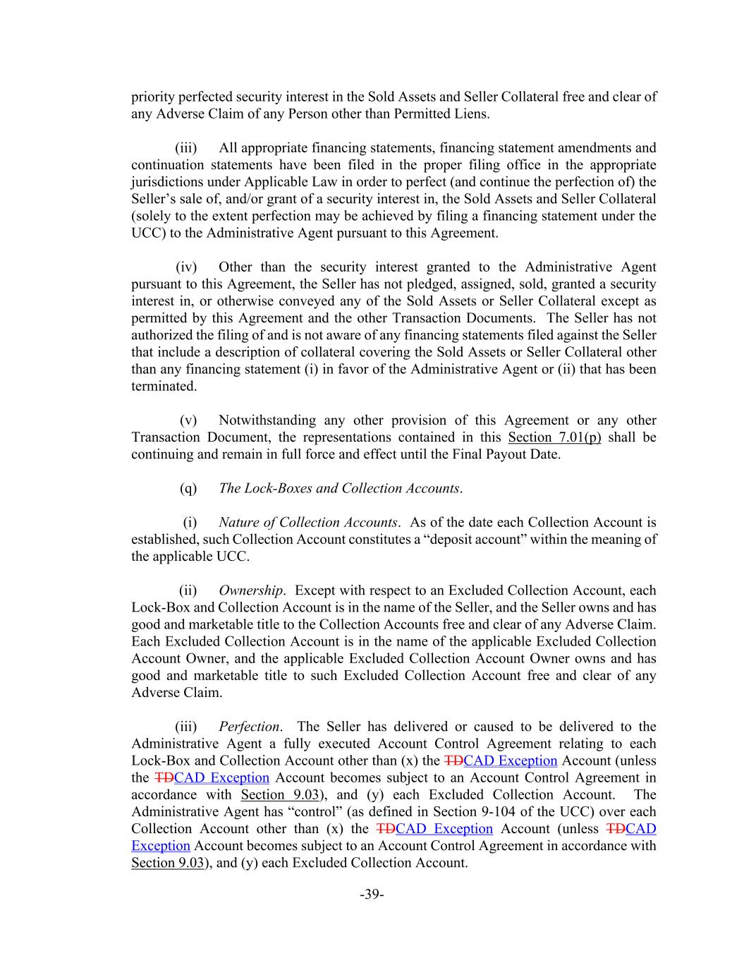-39-优先权完善了出售资产和卖方抵押品上的担保权益,不存在除许可留置权之外的任何人的任何不利债权。(iii)所有适当的融资报表、融资报表修订和延续报表均已根据适用法律在适当的司法管辖区的适当备案处备案,以完善(并继续完善)卖方出售和/或授予所售资产和卖方抵押品的担保权益(仅限于通过根据本协议向行政代理人提交UCC下的融资报表可能达到的完善程度)。(四)除根据本协议授予行政代理人的担保权益外,除本协议和其他交易文件允许的情况外,卖方没有质押、转让、出售、授予或以其他方式转让任何已出售资产或卖方担保物的担保权益。除(i)有利于行政代理人或(ii)已终止的任何融资报表外,卖方未授权提交且不知道针对卖方提交的任何融资报表,其中包括涵盖已出售资产或卖方抵押品的抵押品说明。(v)尽管有本协议或任何其他交易文件的任何其他规定,本条7.01(p)所载的申述仍须继续进行,并保持完全有效,直至最后付款日期为止。(q)锁箱和收款账户。(i)收款账户的性质。截至每个收款账户成立之日,该收款账户构成适用的UCC含义内的“存款账户”。(二)所有权。除除外收款账户外,每个Lock-Box和收款账户都在卖方名下,卖方拥有并拥有收款账户的良好和可销售的所有权,没有任何不利索赔。每个排除收款账户均以适用的排除收款账户所有人的名义,且适用的排除收款账户所有人拥有并拥有该排除收款账户的良好和可销售的所有权,不存在任何不利索赔。(三)完善。卖方已向行政代理人交付或促使交付与除(x)TDCAD异常账户(除非TDCAD异常账户根据第9.03节成为账户控制协议的约束)以外的每个Lock-Box和收款账户有关的完全执行的账户控制协议,以及(y)每个被排除的收款账户。行政代理人对除(x)TDCAD异常账户(除非TDCAD异常账户根据第9.03节受账户控制协议约束)之外的每个收款账户拥有“控制权”(定义见UCC第9-104节),以及(y)每个除外收款账户。