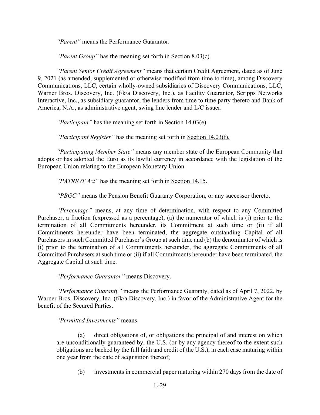 L-29“父母”是指履约保证人。“母组”具有第8.03(c)节规定的含义。“母公司优先信贷协议”指Discovery Communications,LLC、Discovery Communications,LLC的若干全资附属公司、作为融资担保人的Warner Bros. Discovery, Inc.(f/k/a Discovery,Inc.)、作为子公司担保人的丨Scripps Networks Interactive,Inc. 斯克里普斯网络互动公司,作为子公司担保人、不时作为其一方的贷款人以及作为行政代理人的美国银行(Bank of America,N.A.)之间日期为2021年6月9日(经不时修订、补充或以其他方式修改)的某些信贷协议。“参与者”具有第14.03(e)节规定的含义。“参与者名册”具有第14.03(f)节中规定的含义。“参与成员国”是指根据欧盟有关欧洲货币联盟的立法,采用或已经采用欧元作为其法定货币的任何欧洲共同体成员国。“爱国者法案”具有第14.15条规定的含义。“PBGC”是指养老金福利担保公司,或其任何继任者。“百分比”是指,在任何确定时间,就任何承诺的买方而言,一个零头(以百分比表示),(a)其分子是(i)在本协议项下的所有承诺终止之前,其在该时间的承诺或(ii)如果本协议项下的所有承诺均已终止,该承诺买方集团中所有买方在该时间的未偿资本总额和(b)其分母是(i)在本协议项下的所有承诺终止之前,所有承诺买方在该时间的总承诺或(ii)如果本协议项下的所有承诺均已终止,此时的聚合资本。“履约保证人”的意思是发现。“履约担保”指日期为2022年4月7日的由Warner Bros. Discovery, Inc.(f/k/a Discovery,Inc.)以行政代理人为受益人为有担保方的履约担保。“许可投资”是指(a)美国(或其任何机构,只要此类债务得到美国的充分信任和信用支持)的直接债务或其本金和利息无条件担保的债务,在每种情况下均在自购买之日起一年内到期;(b)自