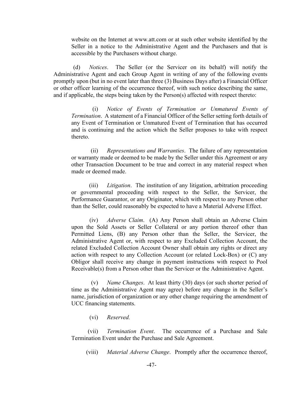 -47-互联网上的网站www.att.com或卖方在给行政代理人和买方的通知中确定的、买方可免费访问的其他网站。(d)通知。卖方(或代表其的服务商)将在财务人员或其他高级管理人员获悉发生以下任何事件时(但在任何情况下不迟于三(3)个工作日后)立即以书面通知行政代理人和每个集团代理人,并附有该通知,说明相同的情况,以及在适用情况下,受影响的人(如适用)就此采取的步骤:(i)终止事件通知或未成熟的终止事件。卖方财务官员的声明,其中载列已发生和正在继续的任何终止事件或未成熟的终止事件的详细信息,以及卖方提议就此采取的行动。(ii)申述及保证。卖方根据本协议或任何其他交易文件作出或被视为作出的任何陈述或保证在作出或被视为作出时未能在任何重要方面真实和正确。(三)诉讼。就卖方、服务人、履约保证人或任何发起人提起任何诉讼、仲裁程序或政府程序,而就卖方以外的任何人而言,可以合理地预期这些诉讼、仲裁程序或政府程序会产生重大不利影响。(四)不利债权。(a)任何人须就出售的资产或卖方抵押品或其任何部分取得除许可留置权外的反向债权,(b)除卖方、服务人、行政代理人以外的任何人,或就任何除外收款账户而言,有关的除外收款账户所有人须就任何收款账户(或有关的锁箱)取得任何权利或指示任何行动,或(c)任何义务人须从服务人或行政代理人以外的人收到有关集合应收款的付款指示的任何变更。(五)名称变更。在卖方的名称、组织管辖权发生任何变更或需要修改UCC融资报表的任何其他变更之前至少三十(30)天(或行政代理人可能同意的较短期限)。(vi)保留。(vii)终止事件。买卖协议项下买卖终止事件的发生。(八)重大不利变化。其发生后迅速,