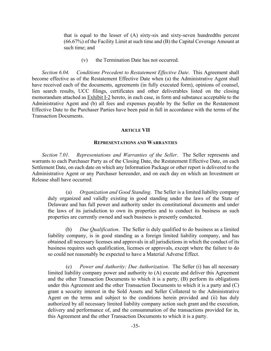 -35-即等于(a)当时融资限额的百分之六十六和百分之六十七(66.67%)与(b)当时的资本保障金额中的较小者;及(v)终止日期未发生。第6.04节。重述生效日期的先决条件。本协议自重述生效日期起生效,前提是(a)行政代理人应已收到作为本协议所附附件 I-2的交割备忘录所列的每份文件、协议(以完全执行的形式)、律师的意见、留置权搜索结果、UCC文件、证书和其他可交付成果,在每种情况下,其形式和实质均为行政代理人可接受,以及(b)卖方在重述生效日期应支付给买方各方的所有费用和开支均已按照交易文件的条款全额支付。第七条代表和授权书第7.01节。卖方的陈述和保证。卖方在截止日期、重述生效日期、每个结算日、在根据本协议向行政代理人或任何买方交付任何信息包或其他报告的每个日期,以及在应已发生投资或解除的每一天向每一买方作出陈述和保证:(a)组织和良好信誉。卖方是一家根据特拉华州法律正式组建和有效存在的具有良好信誉的有限责任公司,并根据其宪法文件和根据其管辖范围的法律拥有拥有其财产和开展其业务的充分权力和权力,因为这些财产目前是拥有的,并且目前正在开展此类业务。(b)适当资格。卖方具有作为有限责任公司开展业务的适当资格,作为外国有限责任公司具有良好的信誉,并已在其开展业务需要此类资格、许可或批准的所有法域获得所有必要的许可和批准,除非未能这样做无法合理地预期会产生重大不利影响。(c)权力和权威;适当授权。卖方(i)拥有所有必要的有限责任公司权力和授权,以(a)执行和交付本协议及其作为一方当事人的其他交易文件,(b)履行其在本协议及其作为一方当事人的其他交易文件项下的义务,以及(c)根据本协议规定的条款和条件向行政代理人授予所售资产和卖方担保物的担保权益,以及(ii)已通过所有必要的有限责任公司行动正式授权此类授予以及执行、交付和履行,本协议及其作为当事方的其他交易文件中规定的交易的完成。