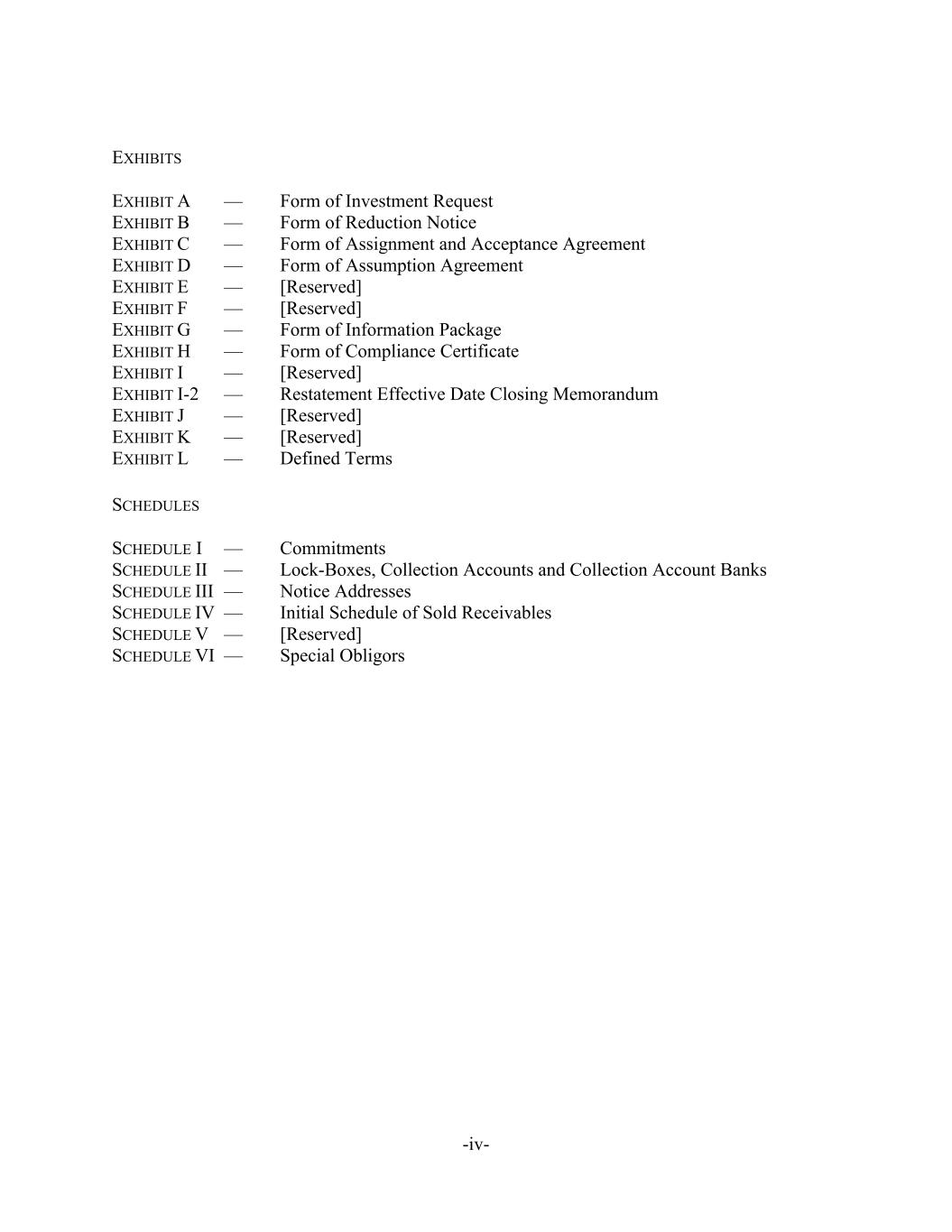 -iv-展品展品A —投资请求表B —减持通知表C —转让和接受协议表D —承担协议表E — [保留]展品F — [保留]展品G —信息包展品H的表格—合规证书展品I的表格— [保留]展品I-2 —重述生效日期截止备忘录J — [保留]展品K — [保留]展品L —定义条款附表I —承诺附表II —锁箱,收款账户和收款账户银行附表三—通知地址附表四—已售应收账款初步附表五— [保留]附表六—特别义务人