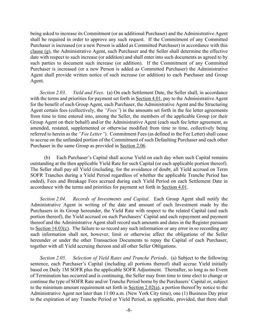 -8-被要求增加其承诺(或增加一个购买者)和行政代理人应被要求批准任何此类请求。如任何承诺买方的承诺根据本(g)条增加(或新增一名人士为承诺买方),则行政代理人、该买方及卖方须确定有关该等增加(或增加)的生效日期,并须订立该等各方同意的文件,以记录该等增加(或增加)。如任何承诺购买者的承诺增加(或新增一人为承诺购买者),行政代理人应向每个购买者和团体代理人提供该增加(或新增)的书面通知。第2.03节。产量和费用。(a)在每个结算日,卖方应根据第4.01节规定的付款条款和优先顺序,为每个集团代理人、每个买方、行政代理人和结构设计代理人的利益,向行政代理人支付一定的费用(统称“费用”),金额为卖方、适用集团的成员(或代表他们的集团代理人)和/或行政代理人之间不时订立的费用信函协议中规定的金额(每个此类费用信函协议,经修订、重述,不时补充或以其他方式修改,在此统称为“收费函”)。承诺费(如费用函中所定义)应停止根据第2.06节的规定在该违约买方和同一集团中的彼此买方的承诺的未提供资金部分中累积。(b)每一买方的资本应在该资本仍未偿还的每一天按该资本(或其每一适用部分)当时适用的收益率累积收益率。卖方应根据第4.01节规定的付款条款和优先顺序,在每个结算日支付所有收益率(包括,为免生疑问,无论适用的分档期是否已经结束,在一个收益期内定期SOFR批次累积的所有收益率)、费用和在每个收益期内累积的破碎费。第2.04节。投资和资本记录。各集团代理人应将买方根据本协议对其集团进行的每项投资的日期和金额、相关资本(及其各部分)的收益率、该等买方资本的应计收益率以及每笔还款和付款以书面通知行政代理人,行政代理人应根据第14.03(c)节在登记册中记录该等金额和日期。但是,未能如此记录任何此类信息或在如此记录任何此类信息时出现任何错误,不应限制或以其他方式影响卖方根据本协议或其他交易文件偿还每个买方的资本的义务,以及由此产生的所有收益率和所有其他卖方义务。第2.05节。收益率和档期的选择。(a)在符合以下一句的情况下,每个买方的资本(包括其所有部分)应根据每日1M SOFR加上适用的SOFR调整数初步累积收益率。此后,只要没有发生终止事件并且仍在继续,卖方可不时选择改变或延续由买方资本承担的SOFR利率和/或分割期的类型,或在符合第2.02(a)节规定的最低金额要求的情况下,不迟于上午11:00(纽约市时间)(任何分割期或收益期(如适用)届满前一(1)个工作日)通过通知行政代理人的方式改变或延续其中的一部分,但须有