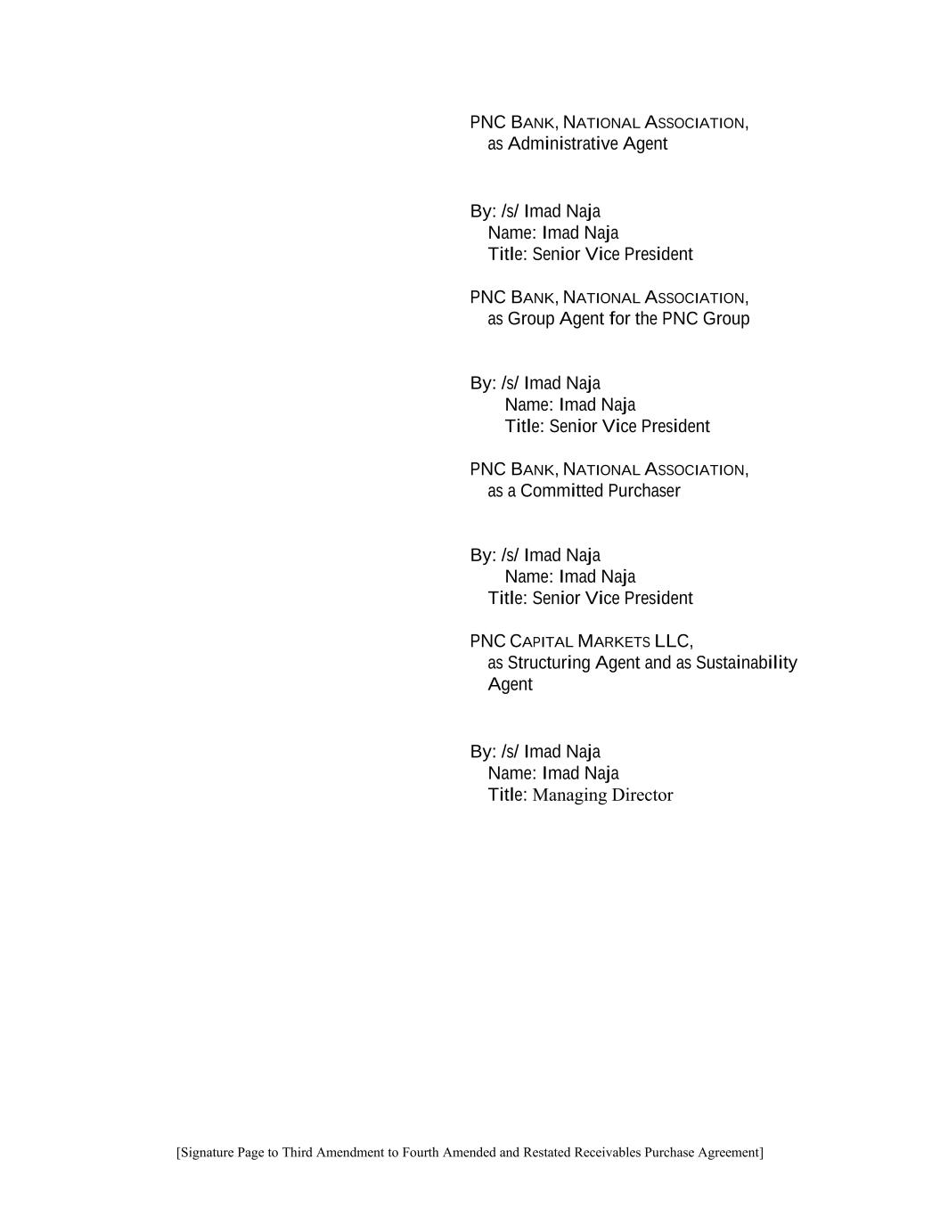 【第四次修订和重述的应收账款购买协议第三次修订的签名页】PNC银行,全国协会,作为行政代理人:/s/imad Naja姓名:imad Naja职务:高级副总裁PNC银行,全国协会,作为PNC集团的集团代理人,由:/s/imad Naja姓名:imad Naja职务:全国协会高级副总裁PNCTERM3银行,作为承诺购买者:/s/imad Naja姓名:imad Naja职务:高级副总裁TERM0 PNC PNC CAPITAL MarkETS LLC,作为结构代理和可持续发展代理,由:/s/imad